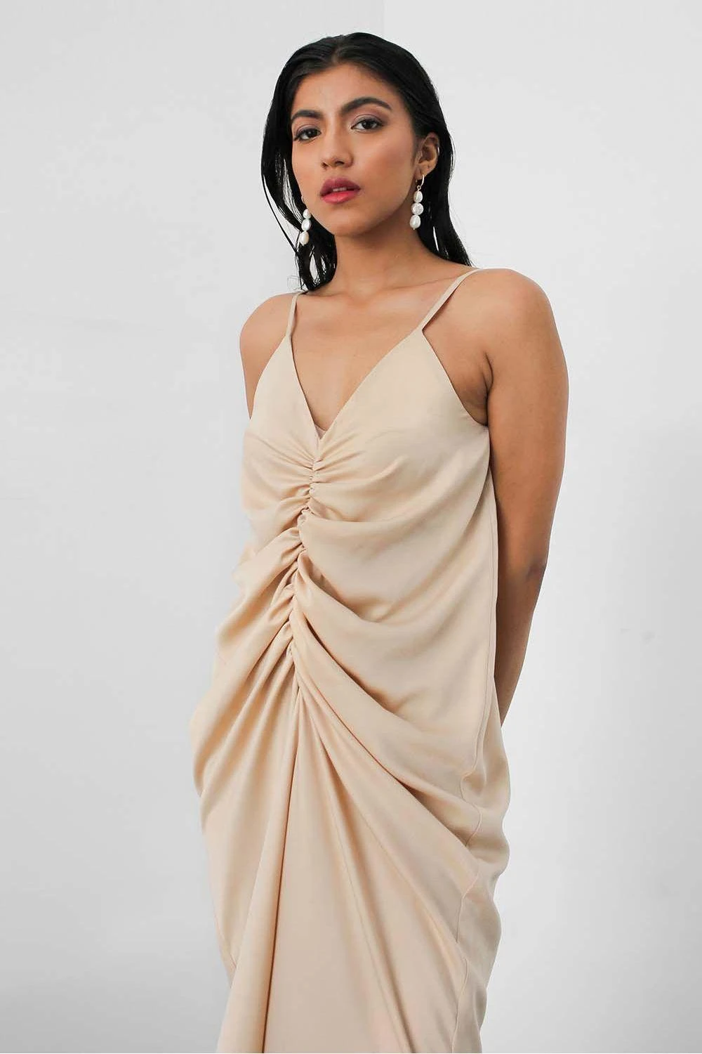 The ease of a slip dress but is enhanced with ruched detailing along the front that creates a flattering silhouette. This beige piece detailed with a deep V neckline, dainty straps and slits along the side makes this slip dress flirty and feminine.