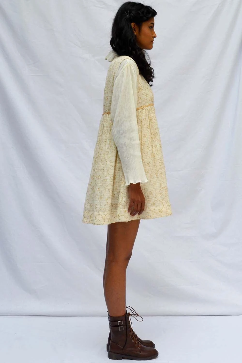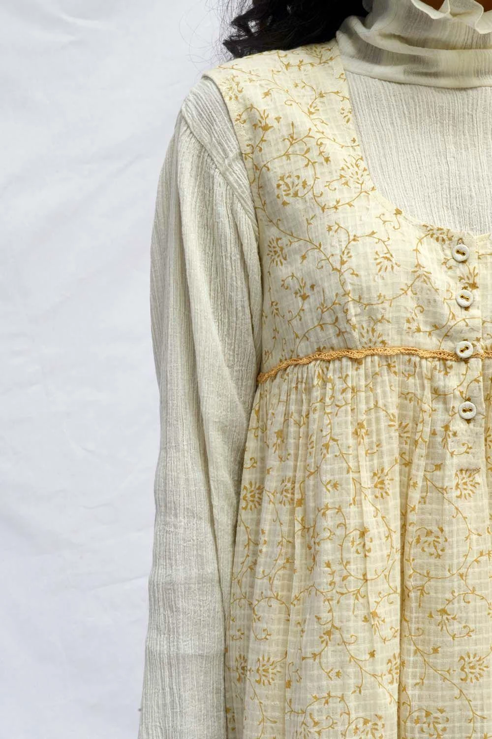Captivatingly feminine and whimsical, this dress features cascading gathers. It embraces intricate crochet work at the empire line. This dreamy design is the perfect balance of traditional and contemporary aesthetics.