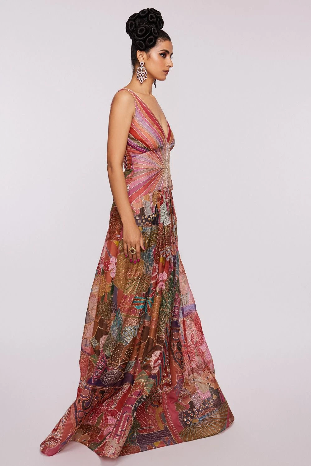 For the modern day brides, this pink printed gown is everything you need to stand out in the crowd. It is made in patchwork printed organza base and uplifted with intricate gold details. You can adorn a pair of diamond danglers with this look.