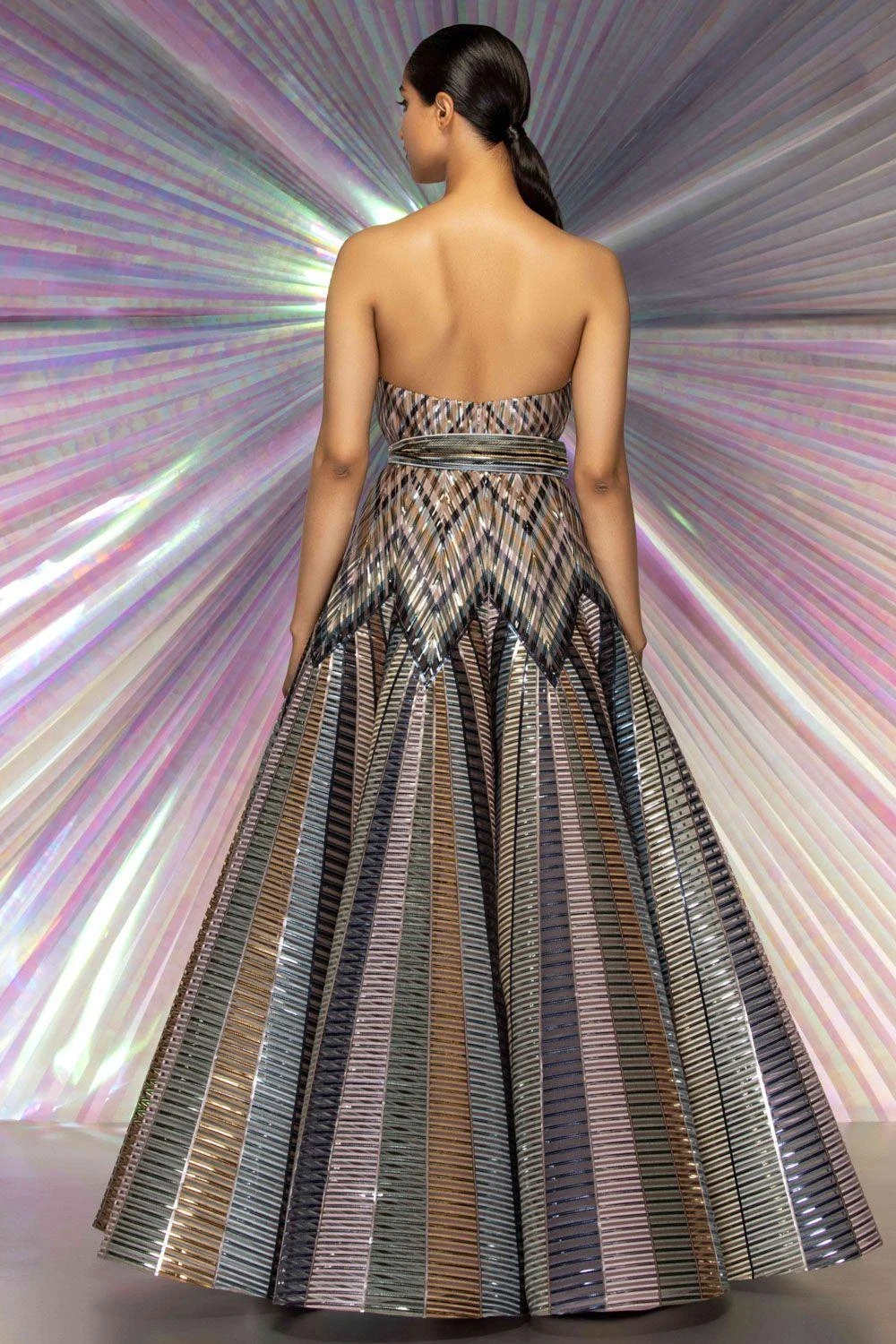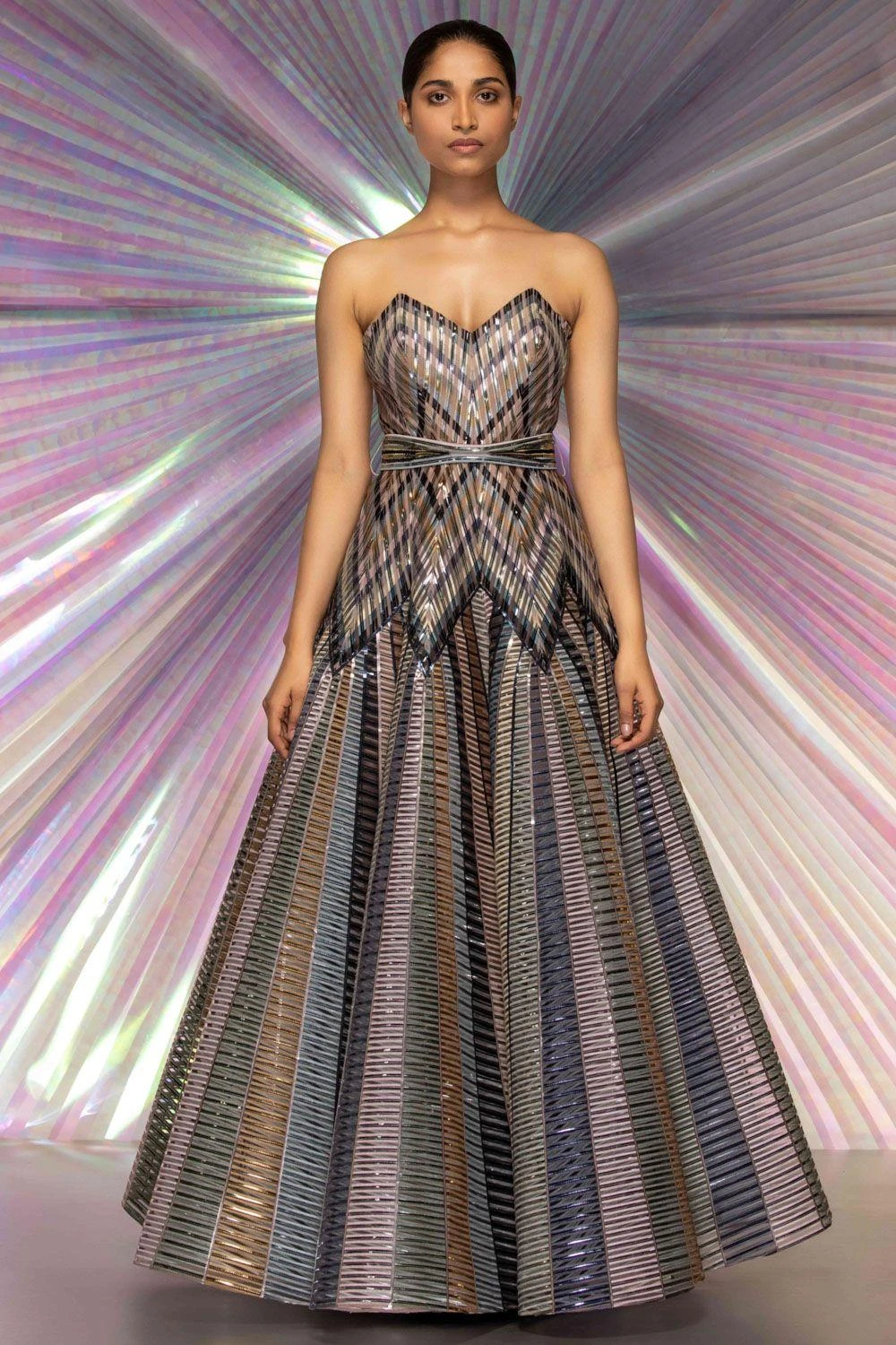 Make a magnetic sangeet or reception bride in this striped starburst structured gown. It is engineered in signature stripe fabric with a corset style bodice which flows down to a voluminous skirt.