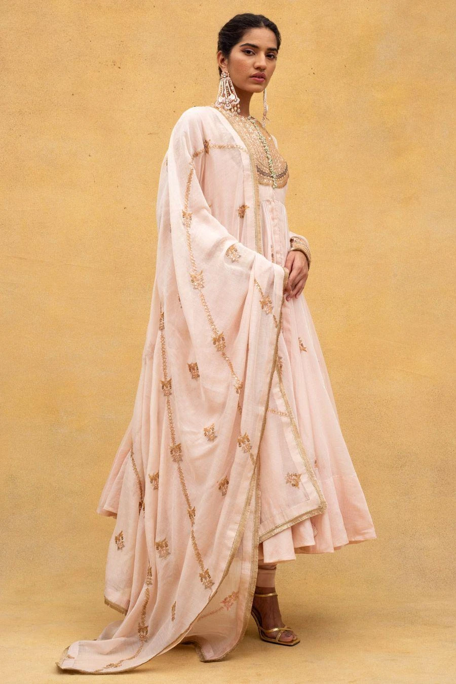 The perfect amalgamation of style and comfort, this anarkali set works across occasions. Crafted in silk, this set features an anarkali with embellished sleeves & yoke paired with a churidar & a dupatta.