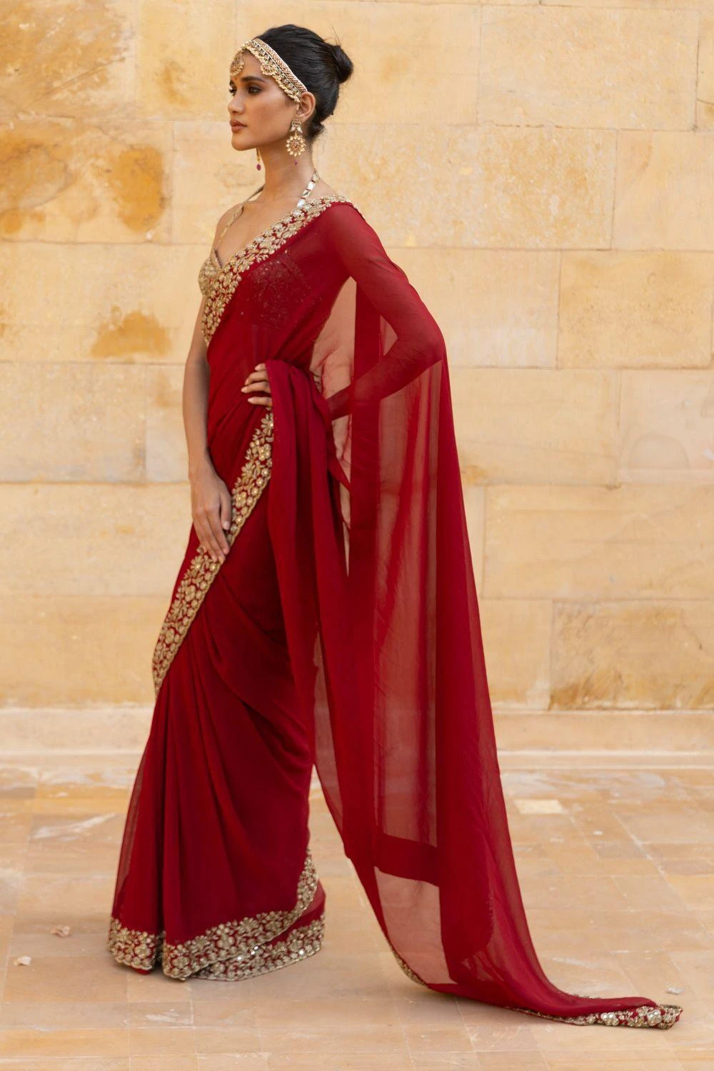 Step into opulent elegance with this hand-embroidered sari set. This ensemble is a testament to the perfect fusion of intricate craftsmanship and modern sophistication, setting the stage for a remarkable look.