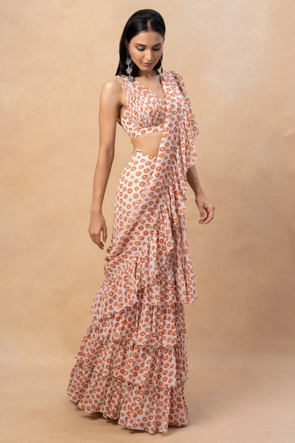 Indulge in the tropical splendor of this floral print ruffle sari & blouse. This captivating ensemble showcases a vibrant print inspired by nature’s bountiful colours. With its cascading ruffles & impeccable craftsmanship, it embodies grace & style.