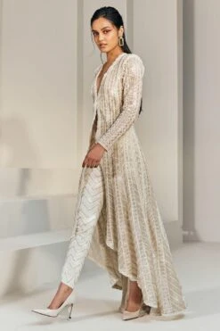 This fuss-free anarkali will see you through all kinds of celebrations this festive season. This anarkali is cut in handloom chanderi with a boondi handblock print. It has intricate zardosi work on the yoke & a belt with tie-up detailing at back.