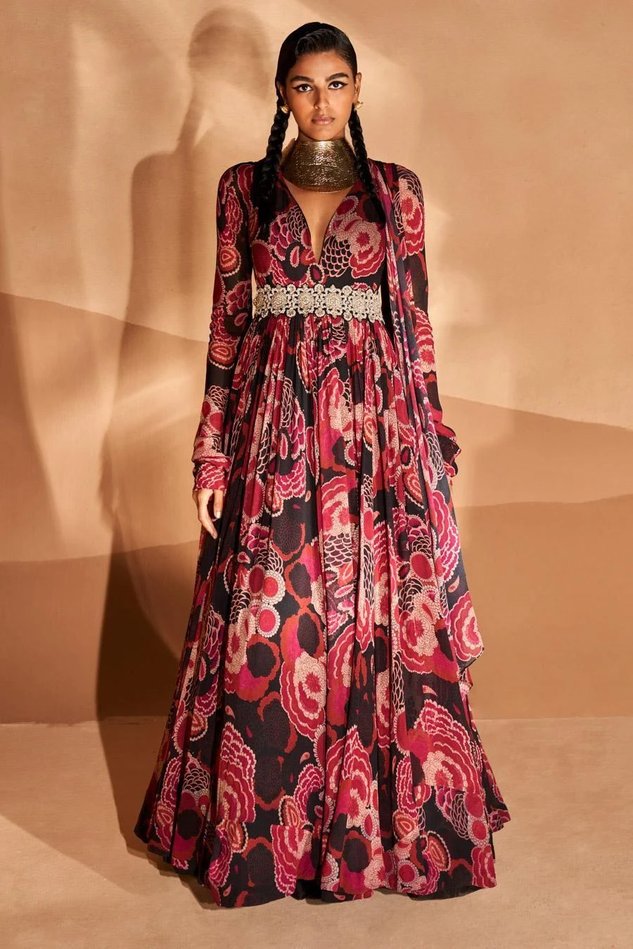Look effortlessly stylish in this black & pink anarkali. Crafted in georgette, this printed anarkali comes with an attached dupatta and is paired with a handcrafted belt with zardosi, dabka and pearl embroidery.