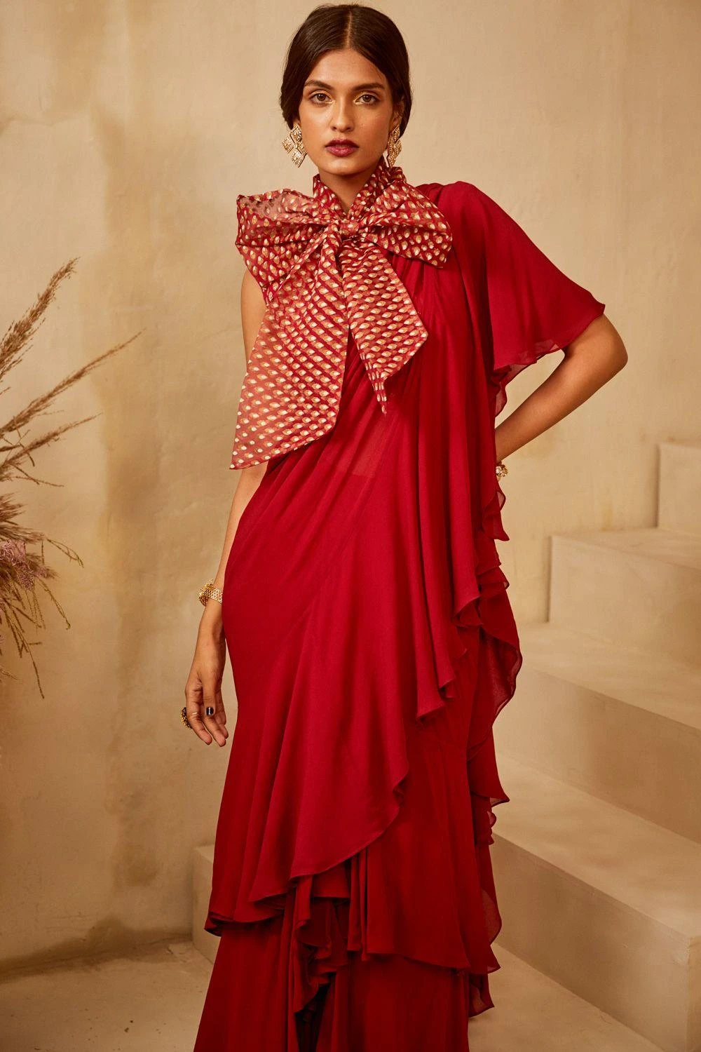 This red ruffle sari set says go extra or go home. The beautiful ruffles on the sari and the extra dramatic bow on the blouse just sums everything up. Style this look with minimal accessories and let it shine on its own.