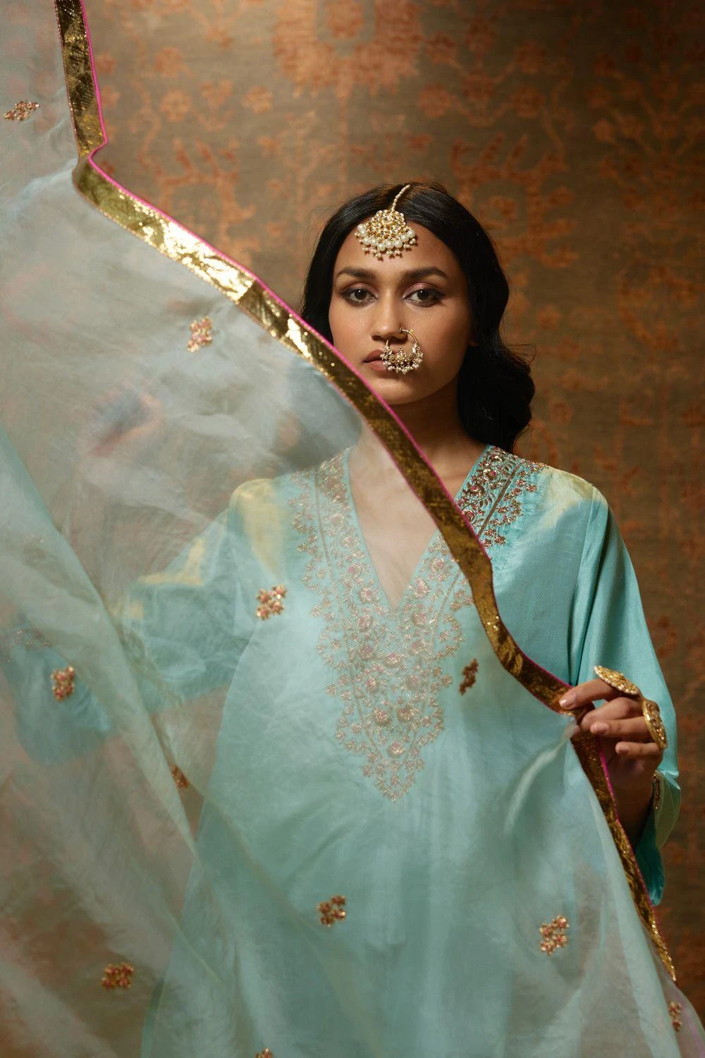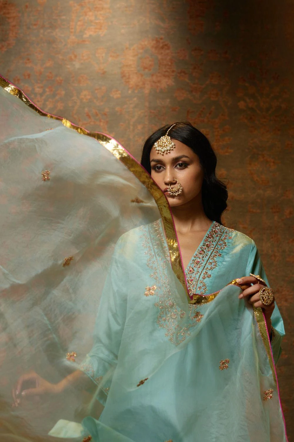 Elevate your ensemble with this hand embellished dupatta. A masterpiece of artistry, the intricate detailing adds a touch of splendour. Draped or styled, it’s a captivating addition to your wardrobe.