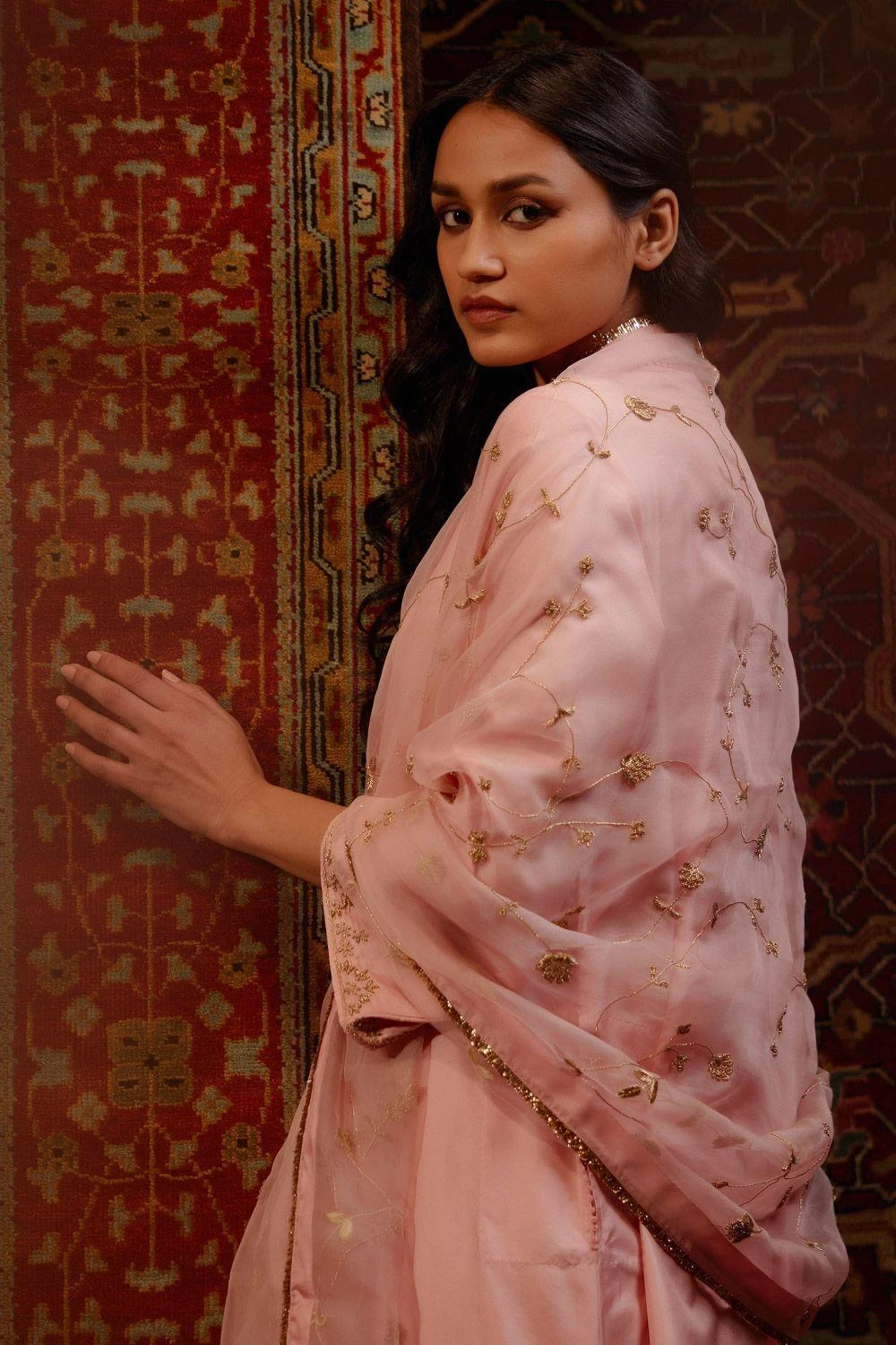 Elevate your ensemble with this hand embellished dupatta. A masterpiece of artistry, the intricate detailing adds a touch of splendour. Draped or styled, it’s a captivating addition to your wardrobe.