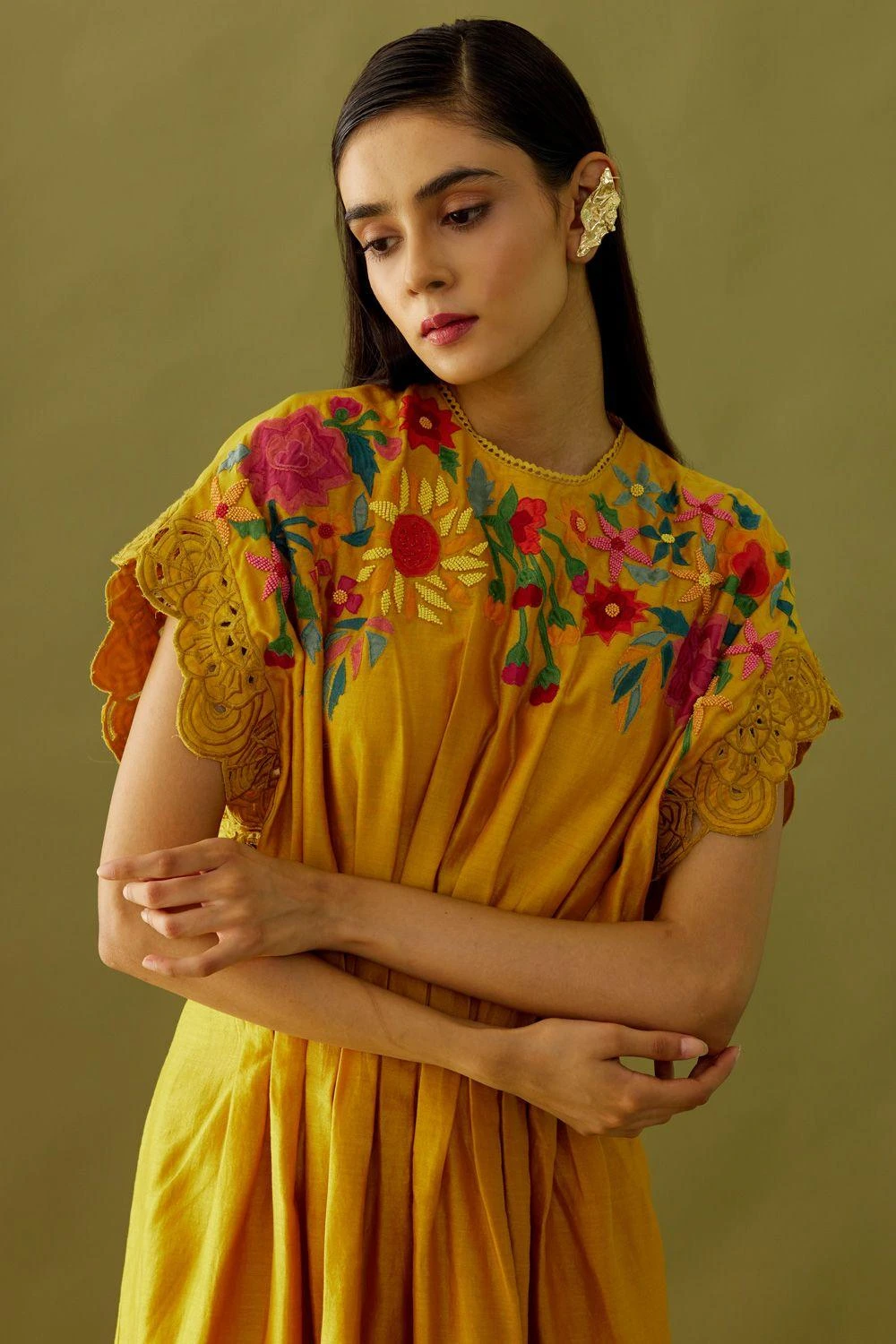Cut in Chanderi, this yellow dress features a pleated waist and floral applique and beadwork embroidery. Style this chic dress with dainty jewellery for daytime events.