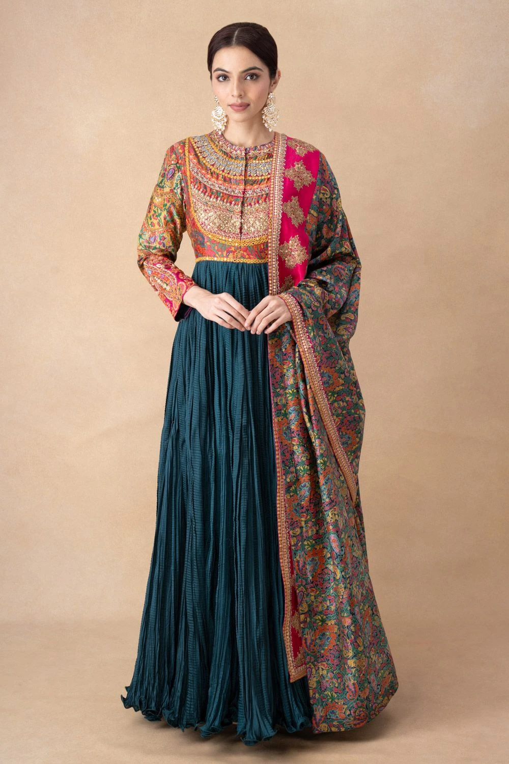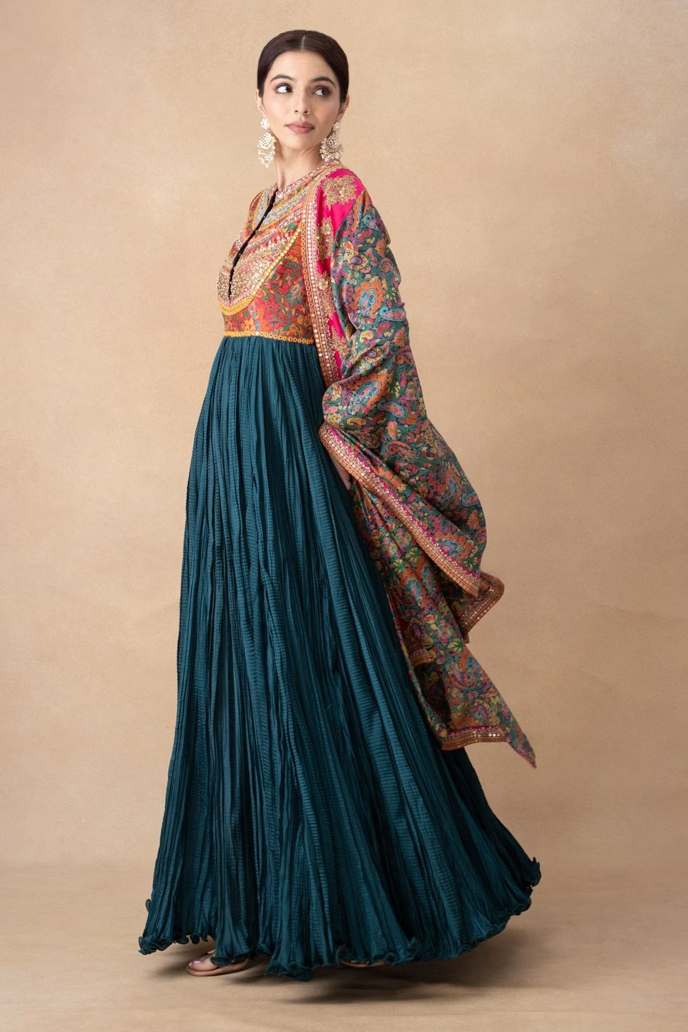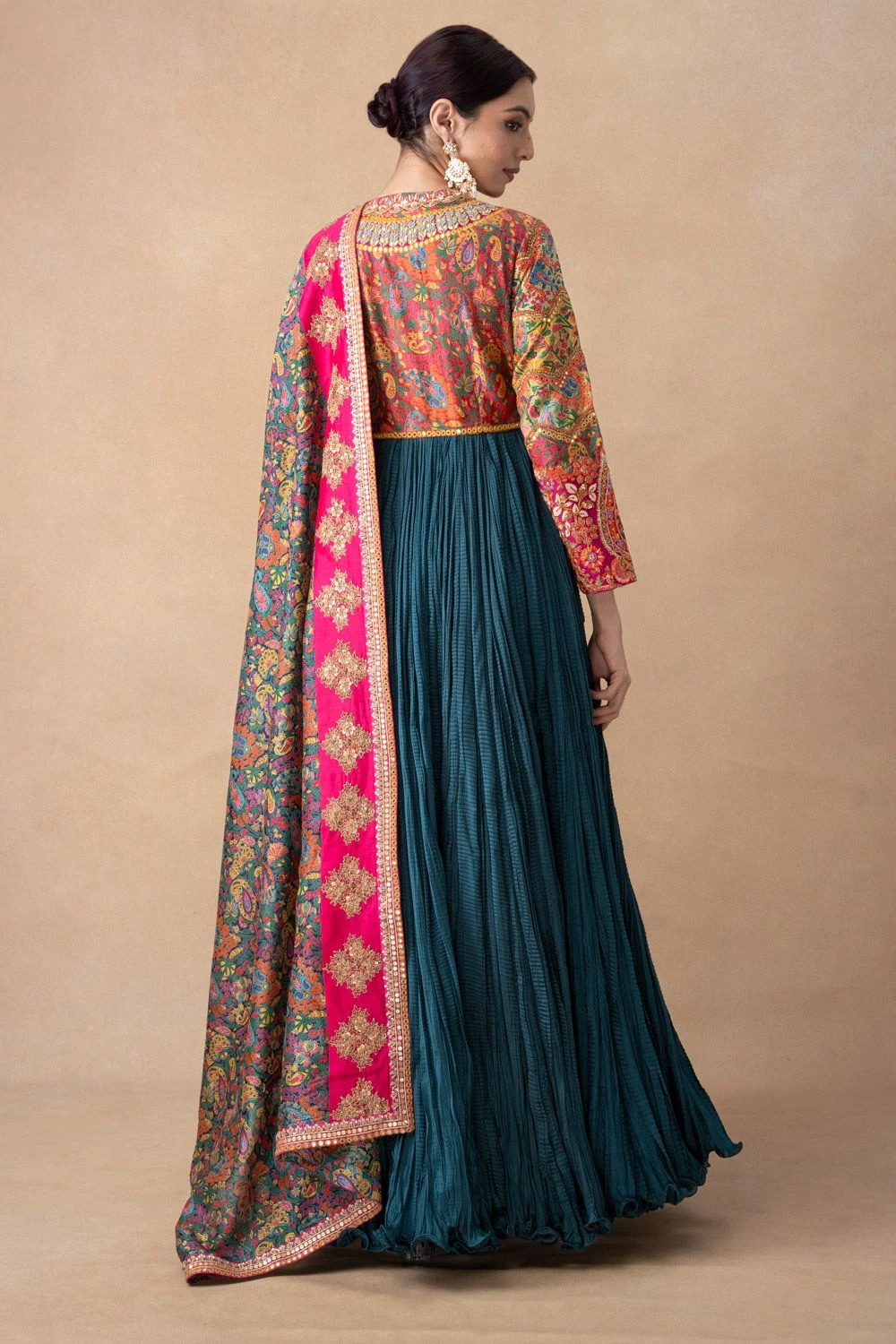 Elevate your style with the exquisite floral printed & embellished anarkali set. Adorned with intricate hand work & crinkling ghera, it comes with an embroidered dupatta. Perfect for weddings or any special celebration. Embrace elegance effortlessly!