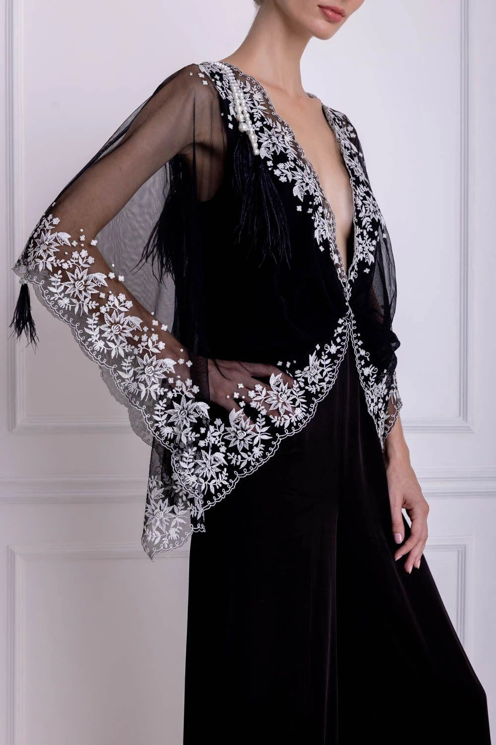 This statement jumpsuit will make dressing up for any evening party a breeze. This black sleeveless jumpsuit crafted in modal satin comes with a net draped ivory kaftan with pearl & feather tassle embellishments.