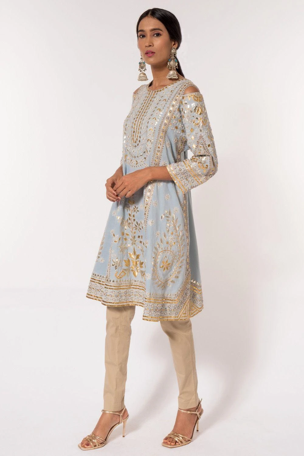 The luxe silk fabrication & lavish gota work on this powder blue kurta makes it a festive must have. It comes along with a pair of beige churidar pants. You can style this look with a pair of jhumkas for daytime functions.