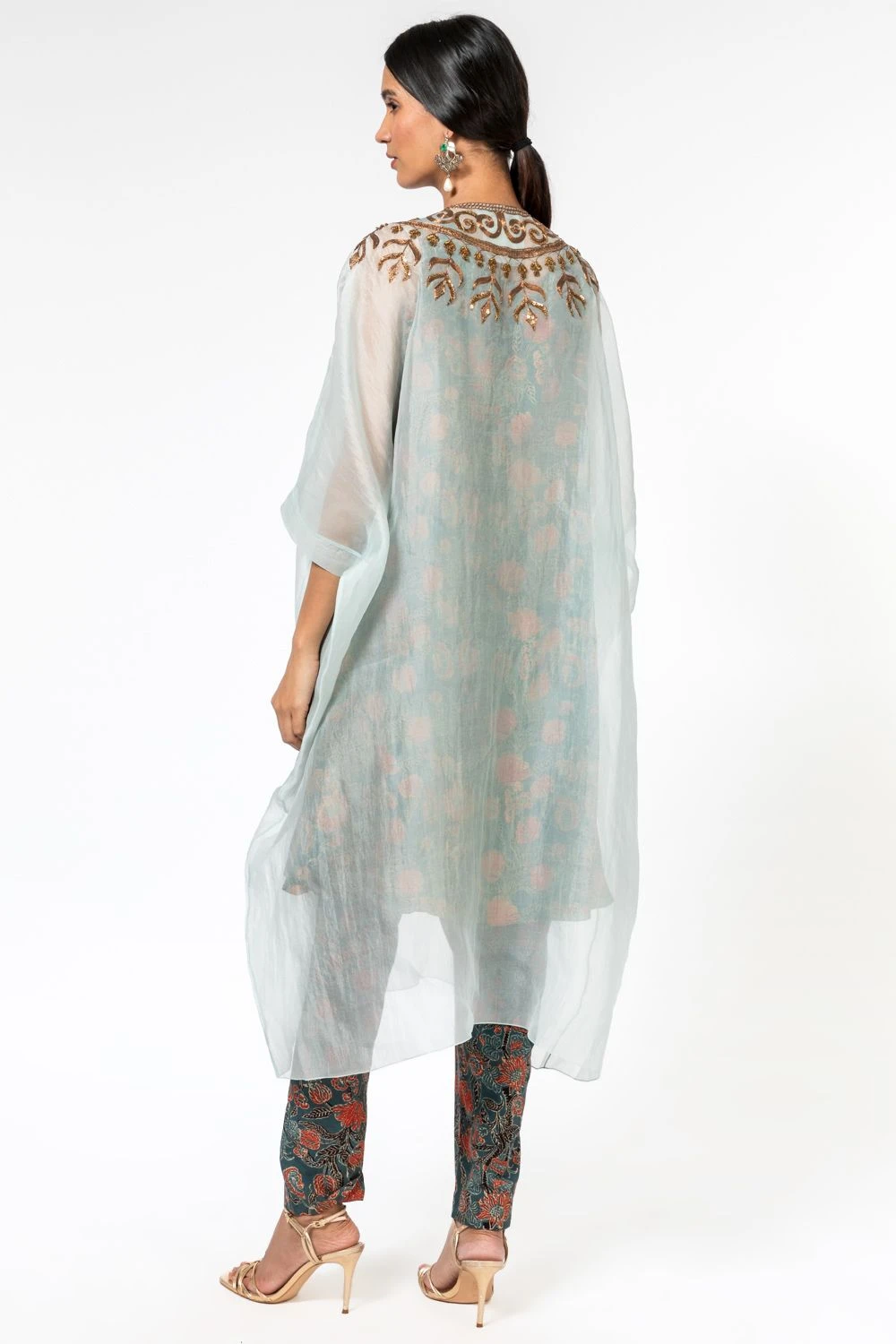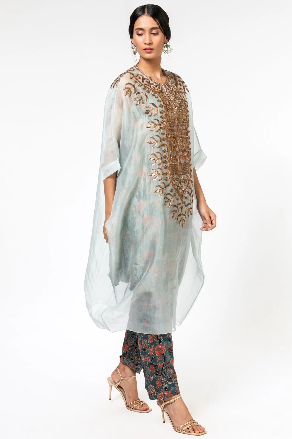 This powder blue kaftan set is minimal yet festive, ideal for your intimate occasions. It features a naturally dyed block printed blue inner & pants, layered with a beautiful organza kaftan with metal dori embroidery.