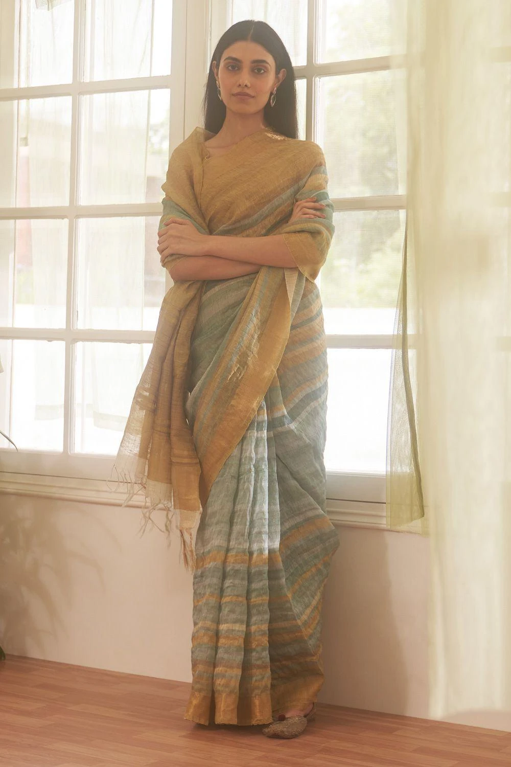 Step into opulence with this sari adorned with stripes & gold zari checks woven seamlessly. It is accompanied by an unstitched blouse fabric, perfectly woven with the sari, creating an ensemble that exudes sophistication and contemporary charm.
