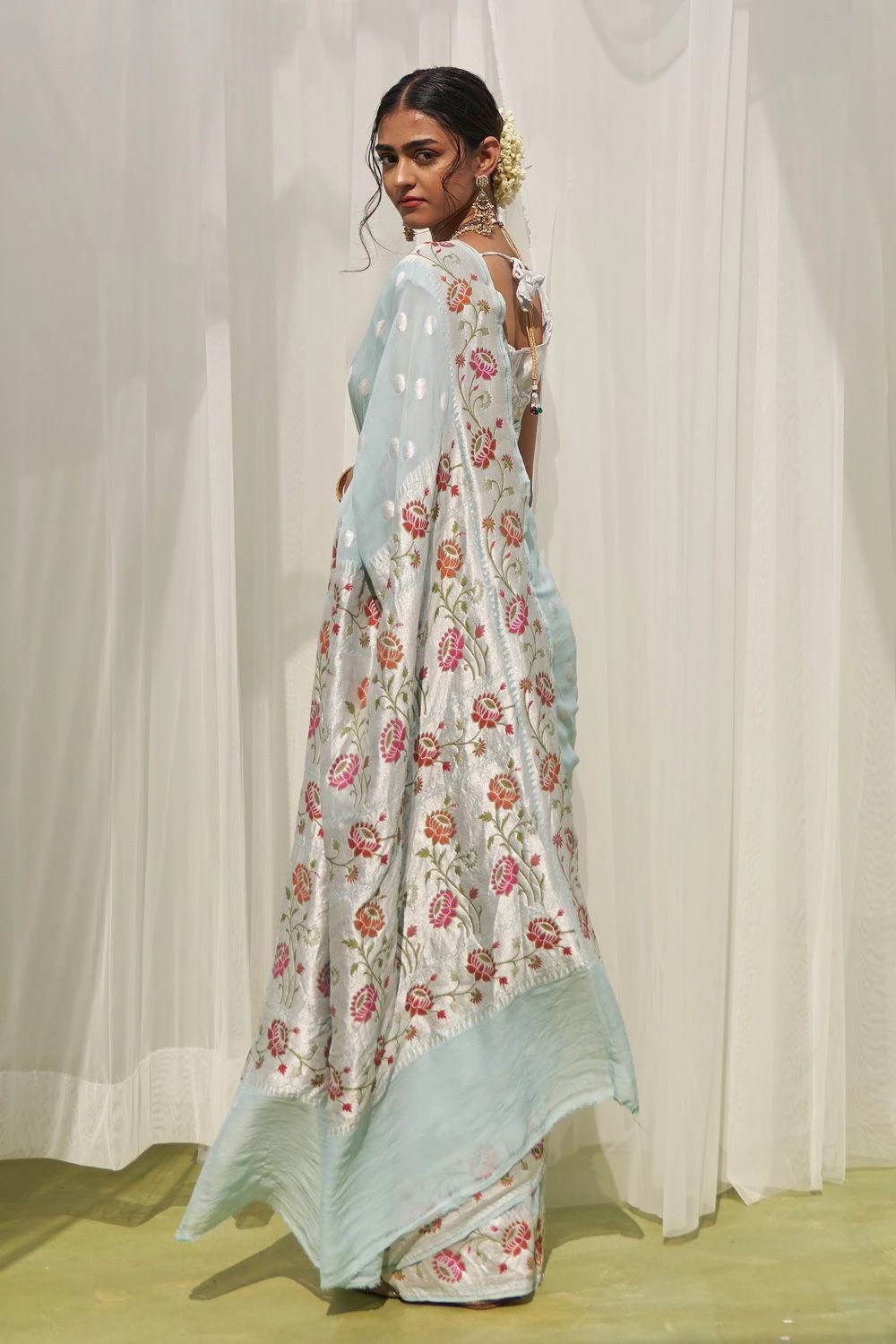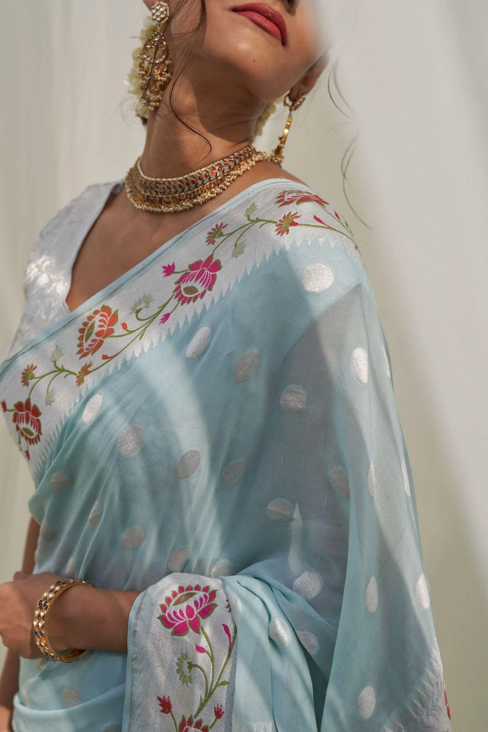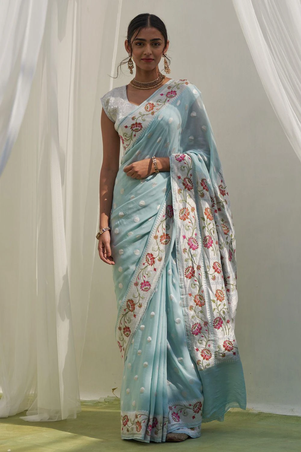 Look effortlessly stylish with this blue sari. Crafted in Khaddi Georgette, this sari features silver polka dots and a floral multi-meena border.