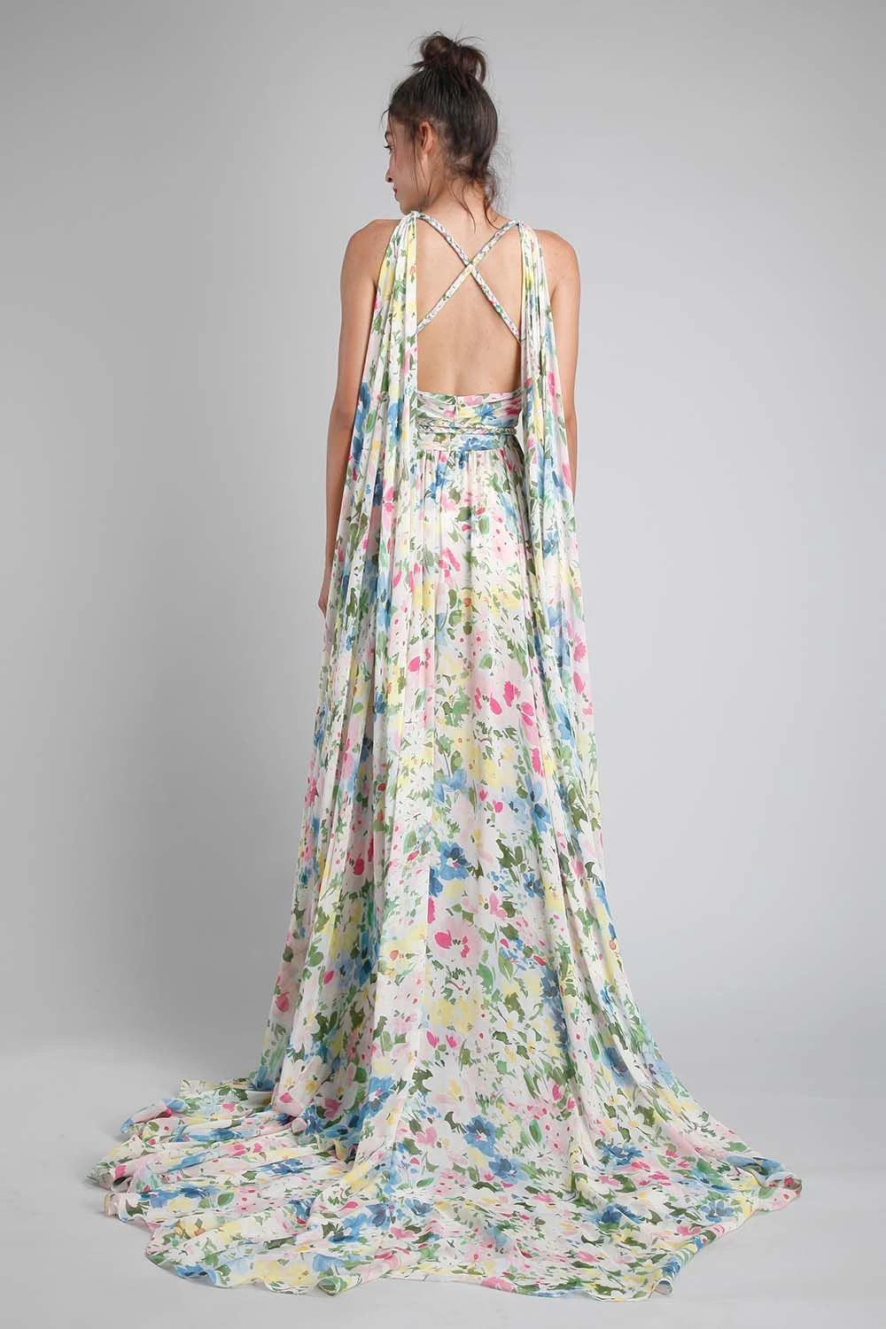 Look like a greek goddess in this belted gown.Designed in a flirty and feminine silhouette, this gown features a deep neck with fitted bodice and a floor touch hem. It is embraced with elongated sleeves. You will exude ultimate opulence in this gown.