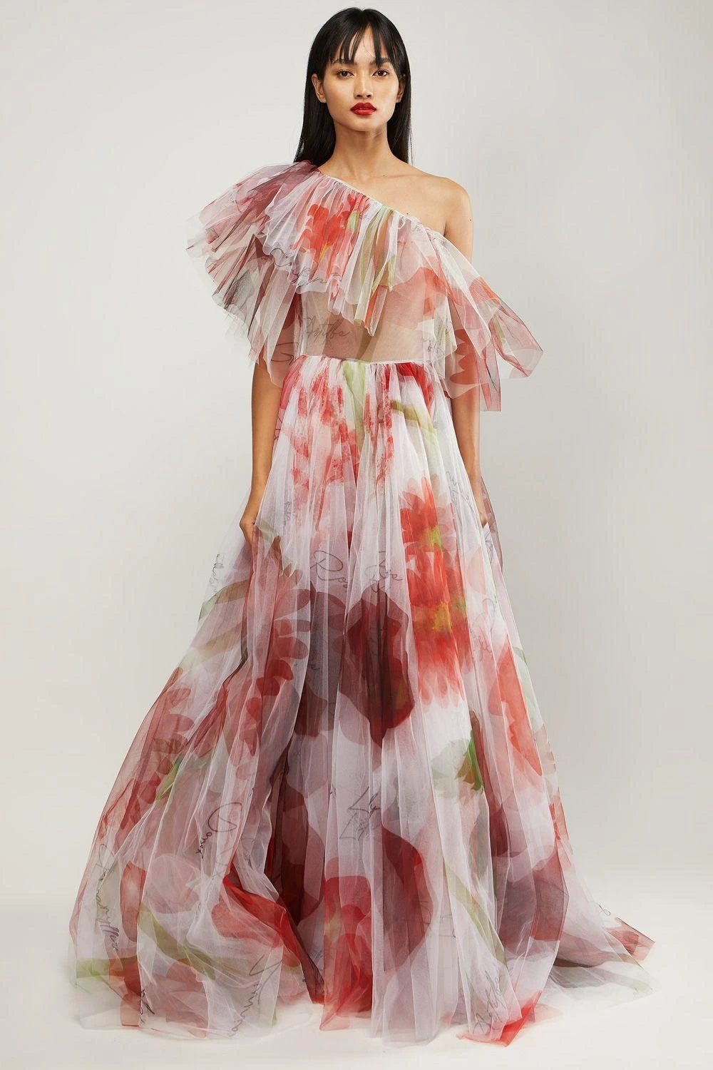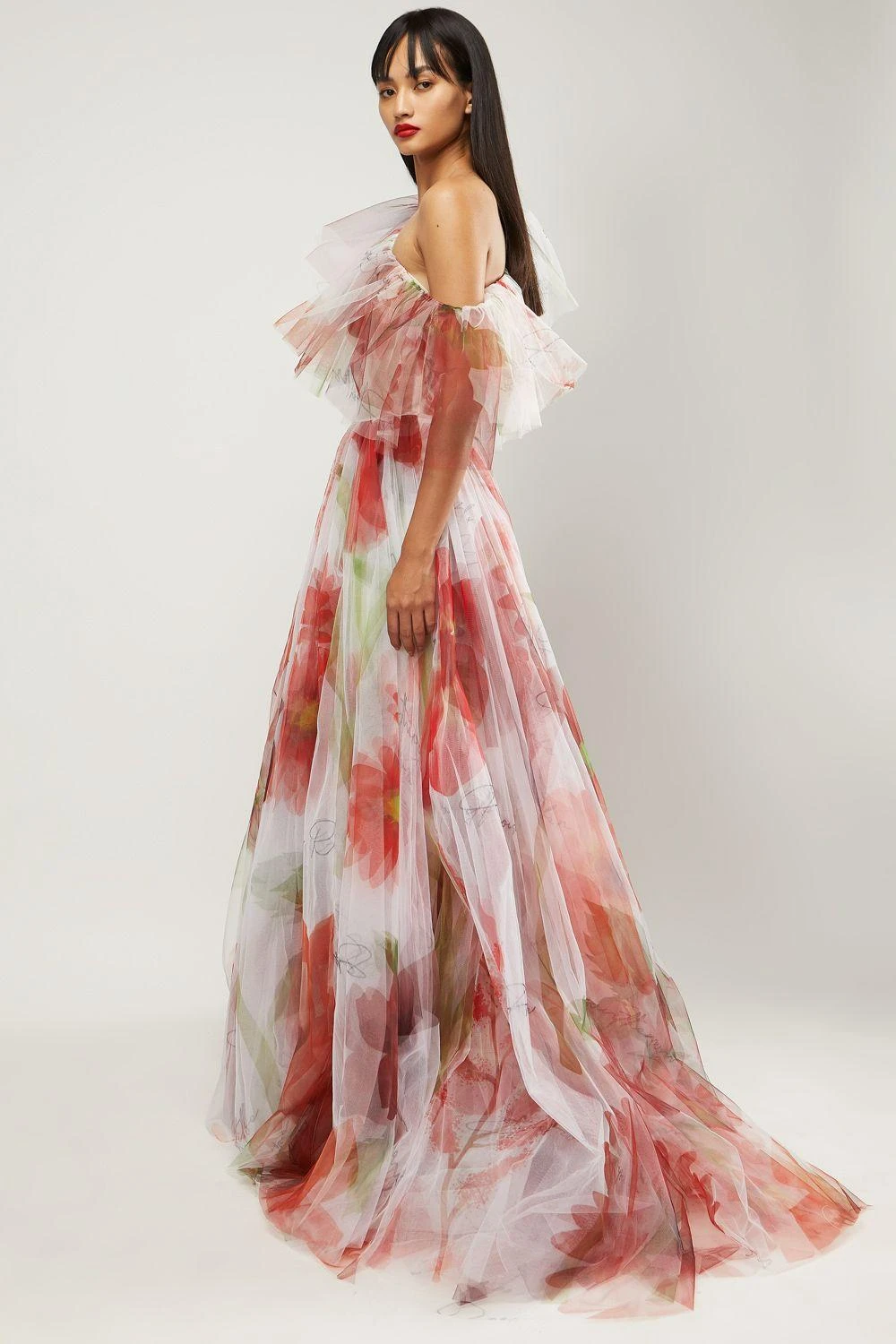 If you’re looking for a head-turning statement-making gown, this is the outfit for you. Crafted in printed net, this tulle gown features a colossal red watercolour botanical print, a cold shoulder detail with ruffles.