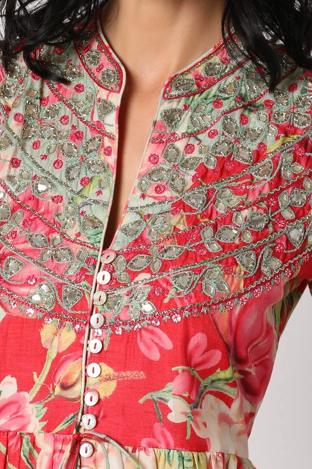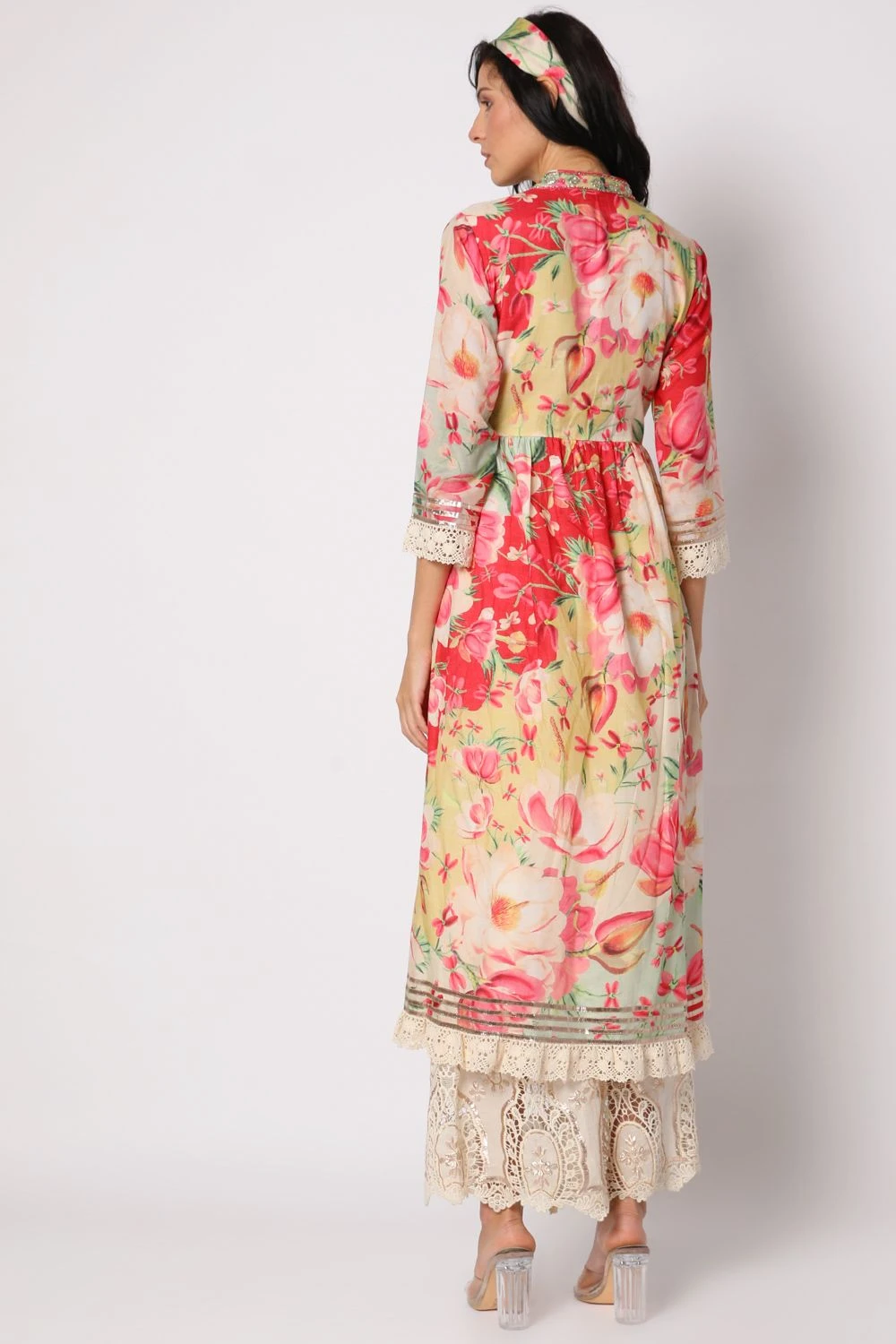This bold floral, front open tunic has elaborate embroidery, using gota and resham work. The gathers at the yolk give a softness and flow to the outfit. Paired with a cutwork embellished palazzo to complete the ensemble.