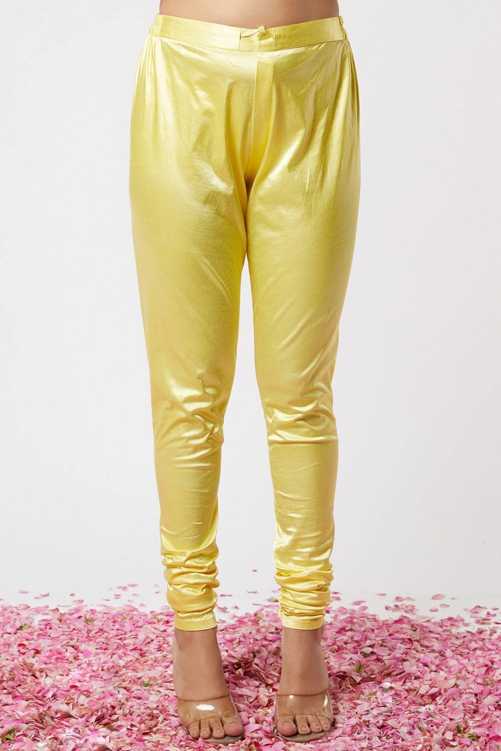 With delicate motifs on a yellow cotton base, this long overlapping anarkali is paired with churidar and a beautifully embellished dupatta. The neckline is enhanced with lavish gota, mirror and thread embroidery.