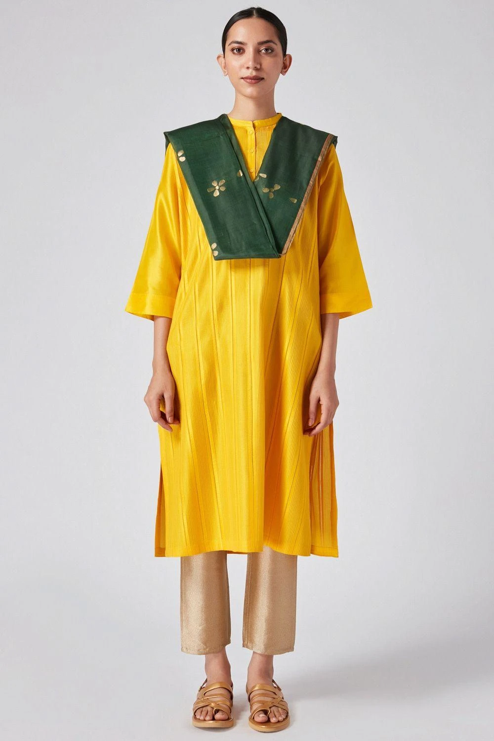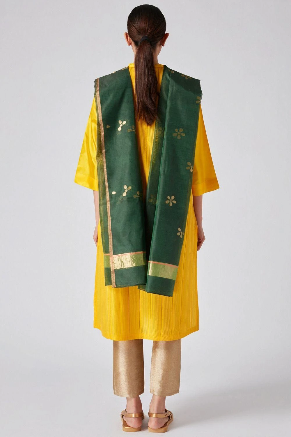 This forest green dupatta is cut in cotton silk chanderi and detailed with woven broken flowers & a gold border. You can team this elegant piece with your kurta sets for a quick look upgrade.