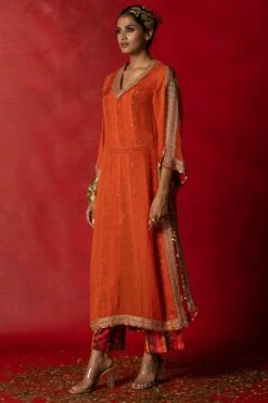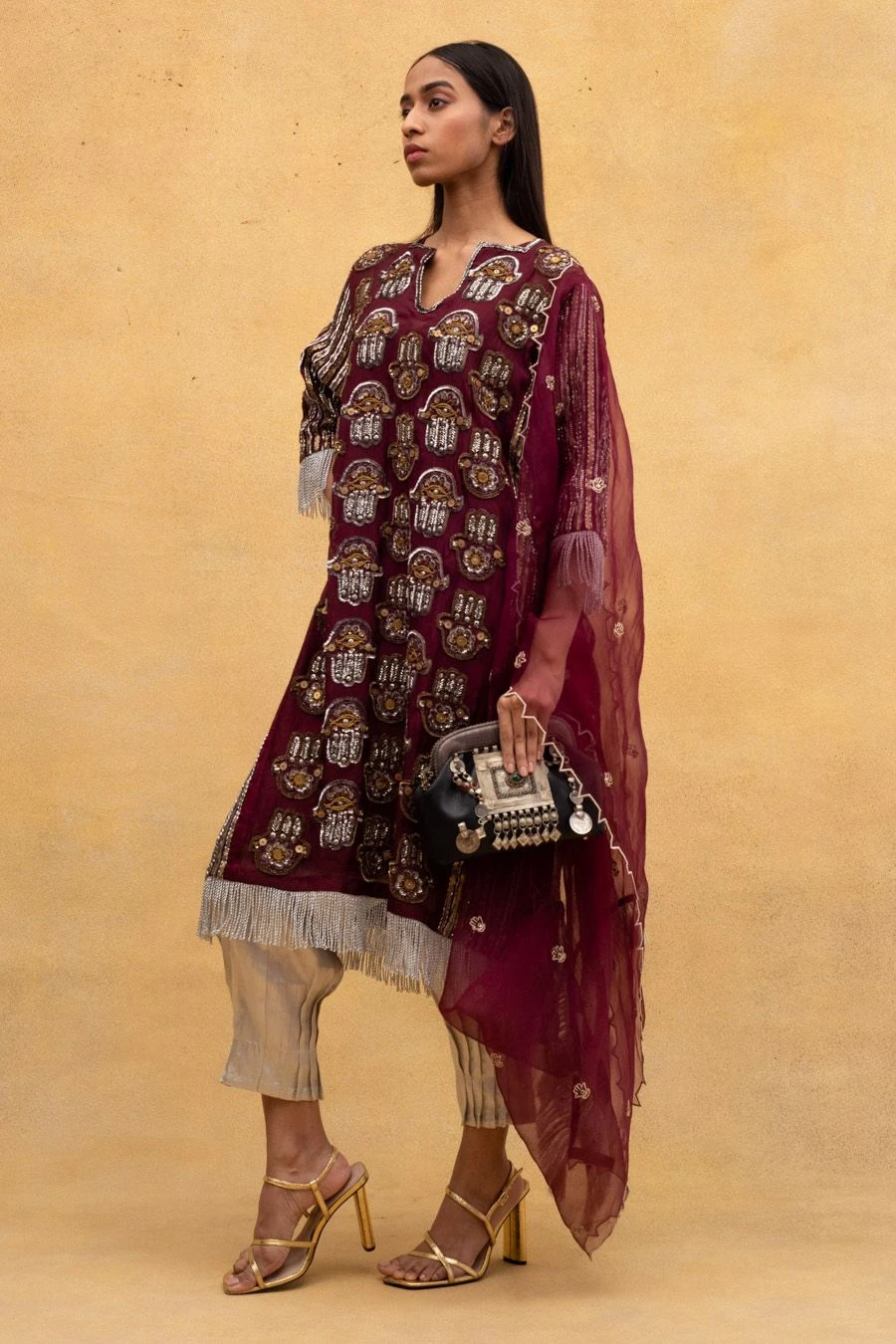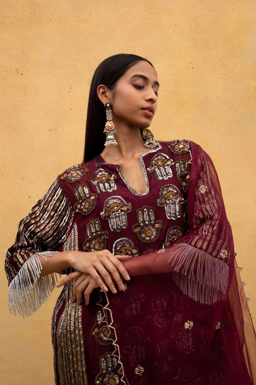 Crafted in silk organza this hand embroidered banjara kurta & pants set is a take on the folklore of eastern Europe with traditional Indian embroidery techniques. Style it with a pair of statement earrings for an ornate evening look.