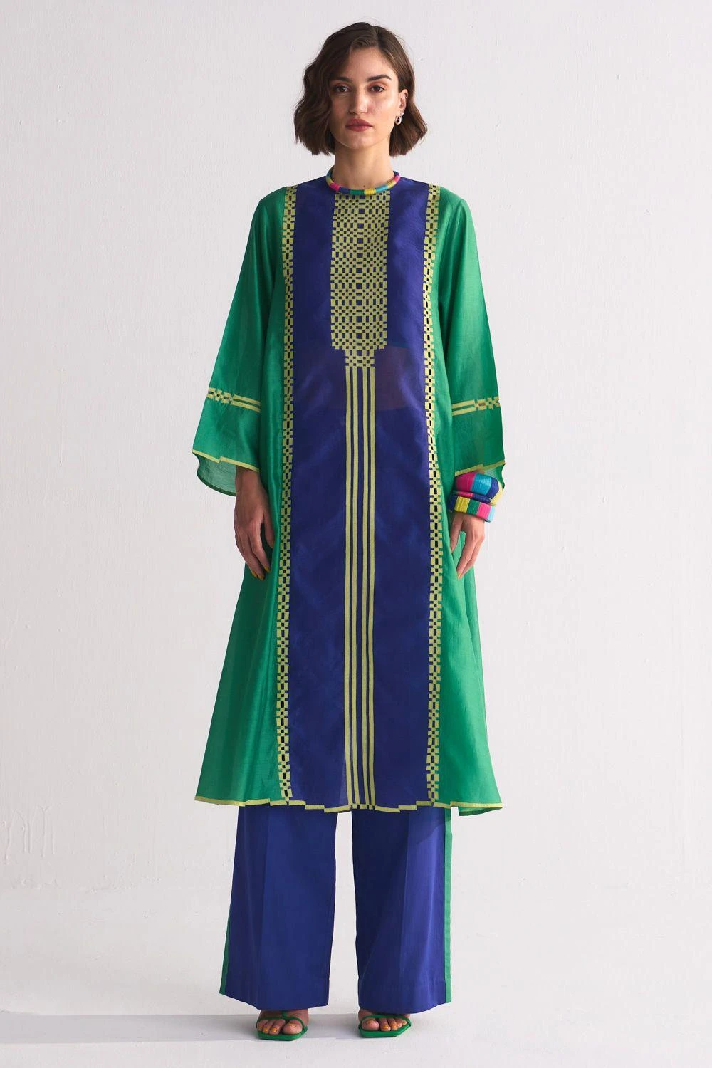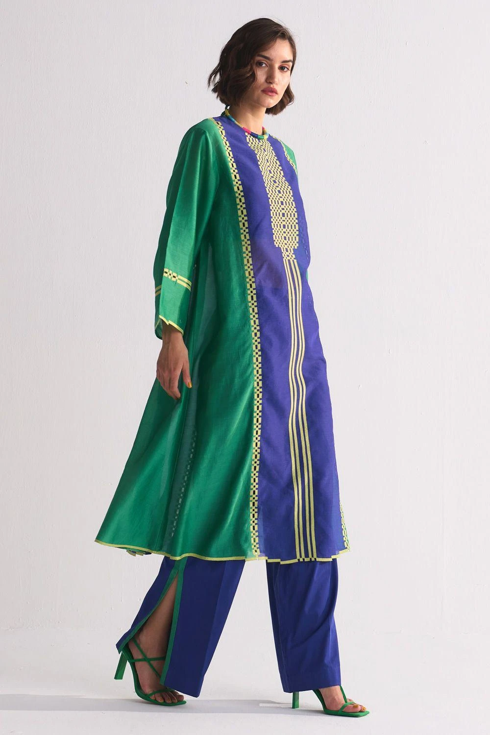 Enriched with artisanal flair and crafted from exquisite chanderi fabric, this resplendent geometric applique kurta exudes a timeless charm that effortlessly blends traditional beauty with contemporary chic.