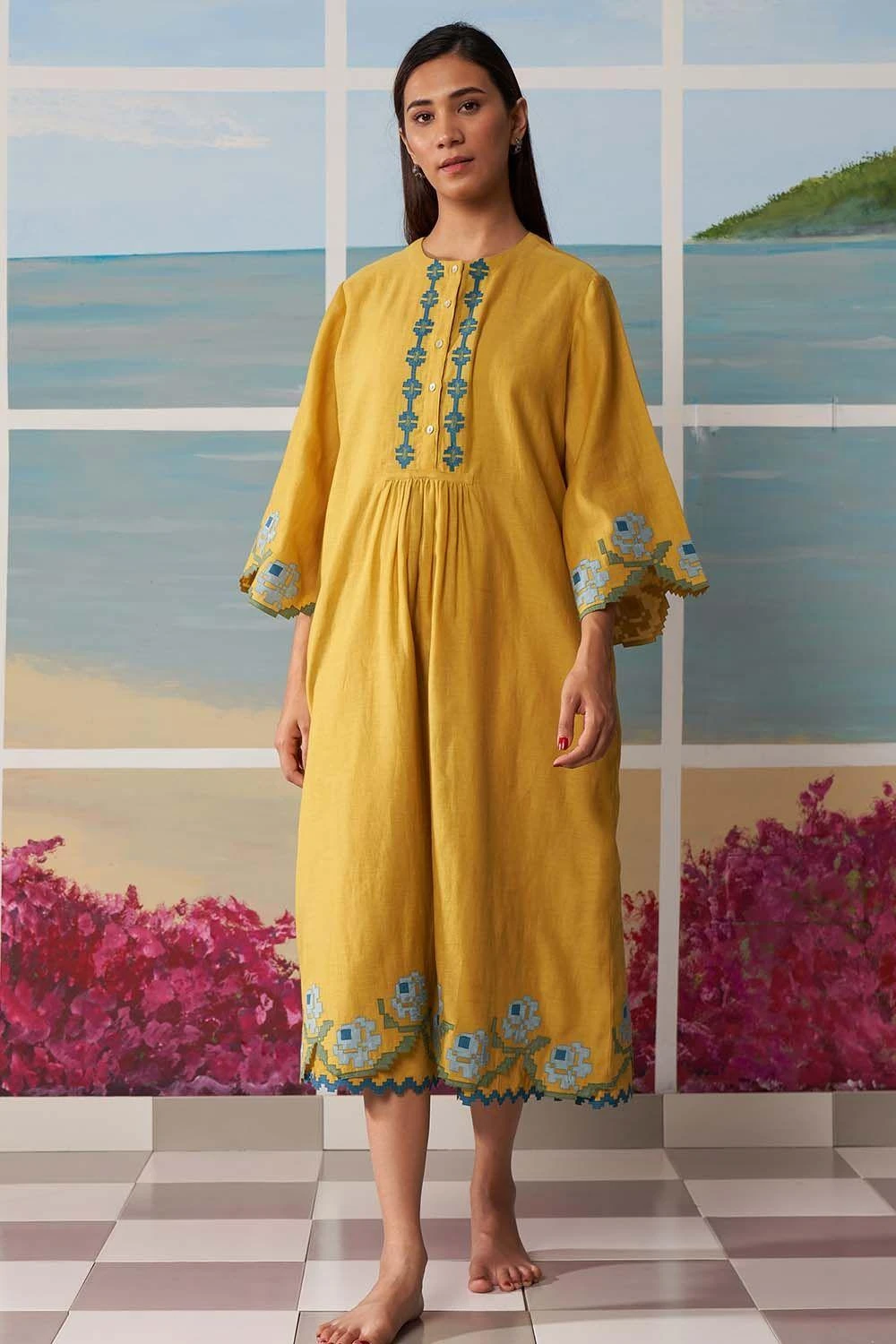 This breezy mustard dress is spun in thin chanderi. The delicate grid rose applique adds an element of contrast colour to the style.