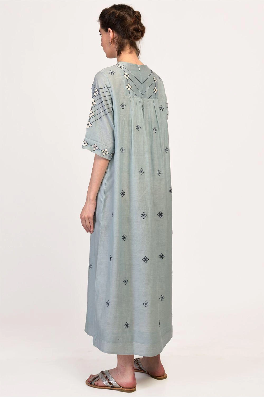 Chic & forgiving, this sky blue gathered dress is a classic choice to wear for a long day in town. Pair it with sneakers and mismatched earrings.
