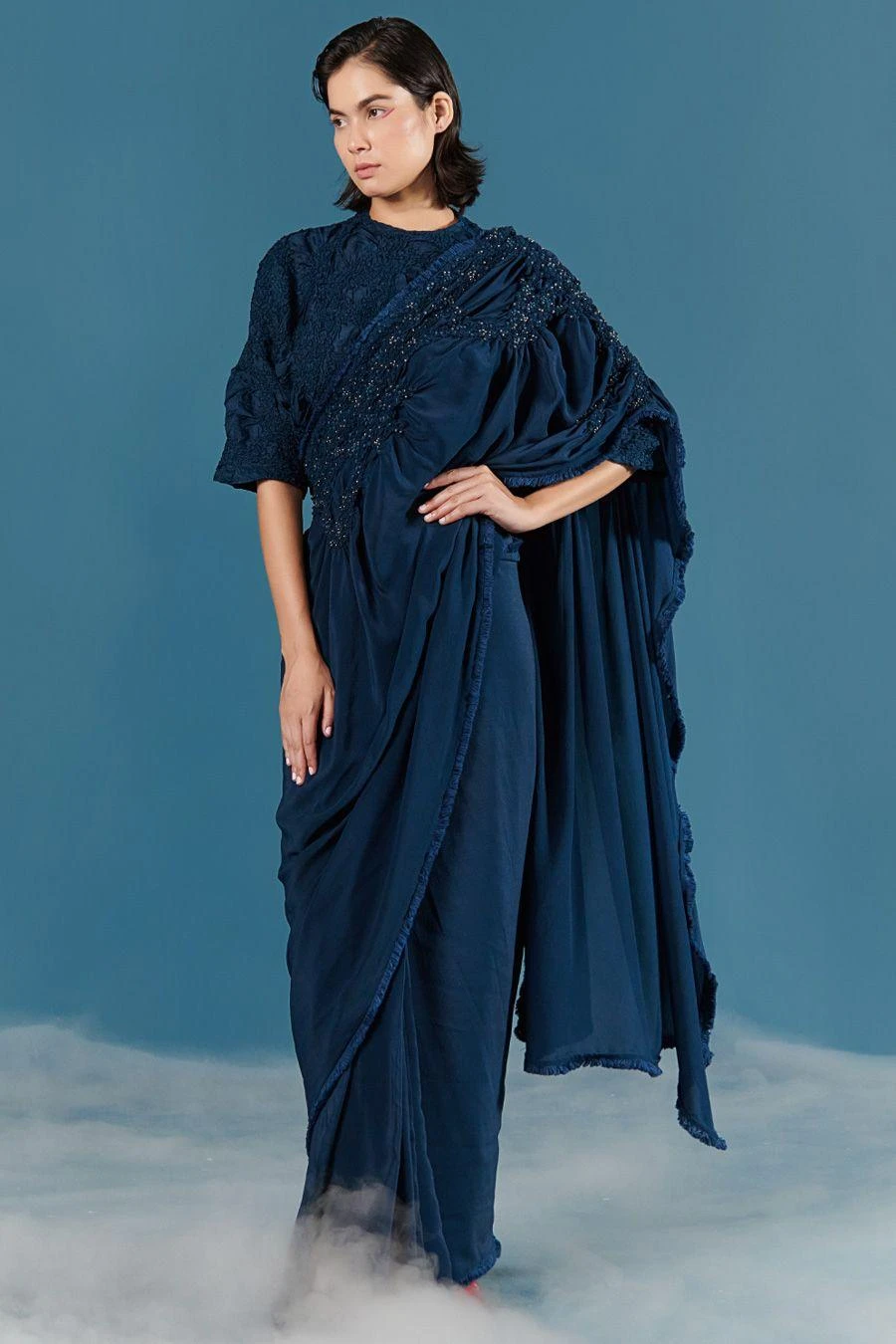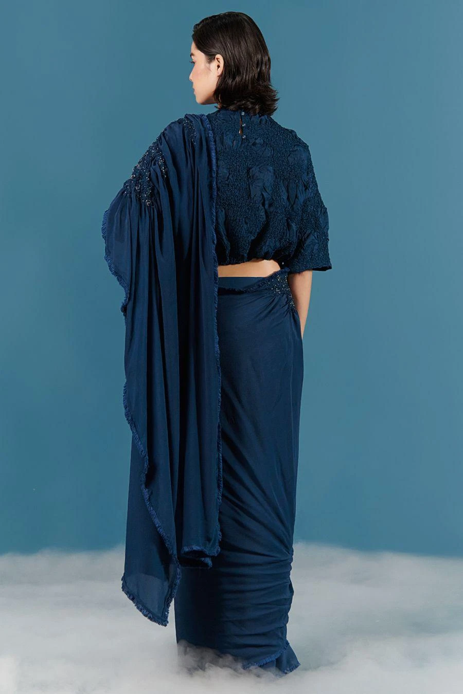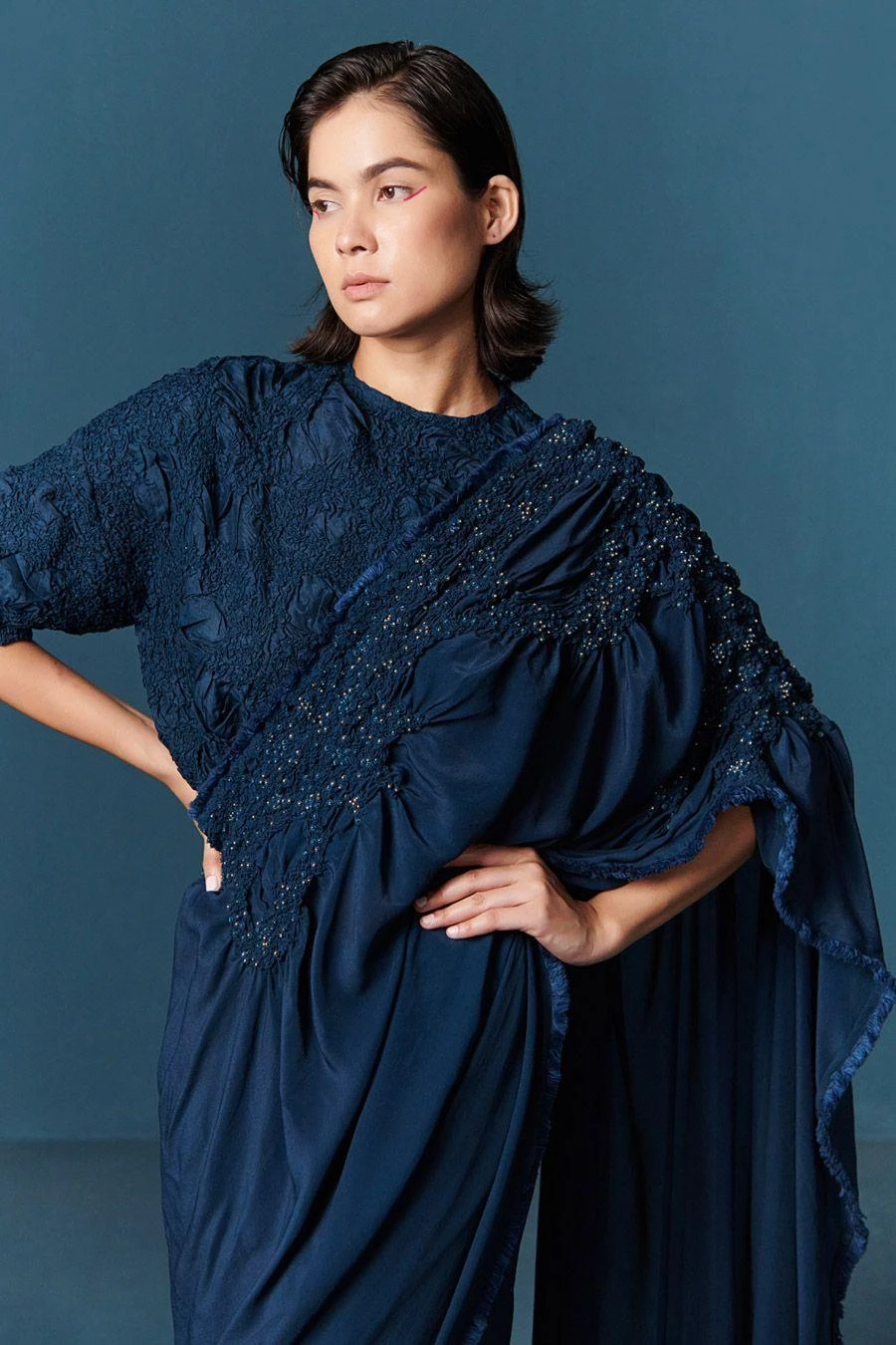 With a playful juxtaposition of texture and colour, ILK effortlessly blends tradition with modernity with this smocked sari. Crafted in silk crepe, this embellished sari features a smocked palla & is paired with a top.