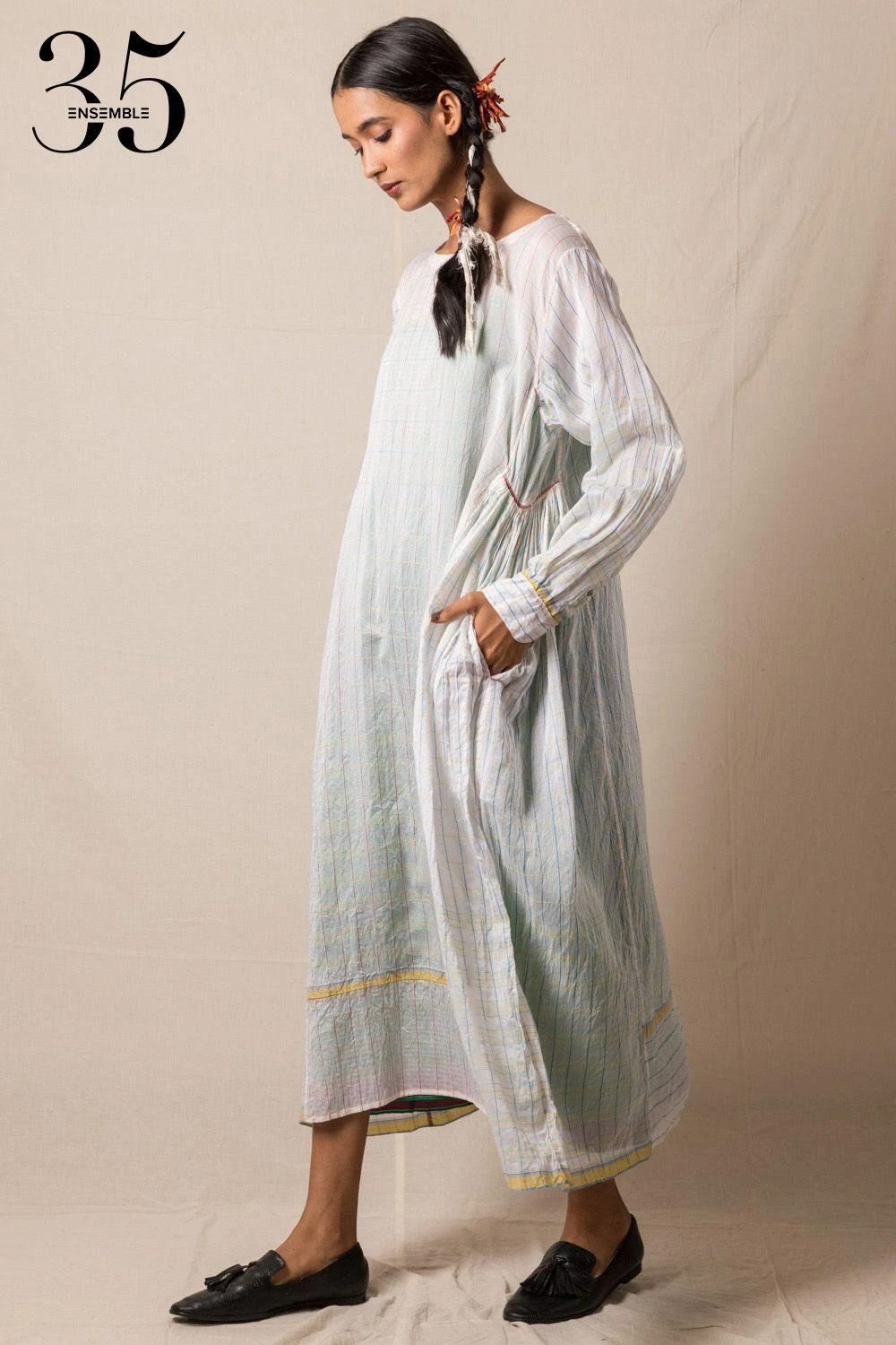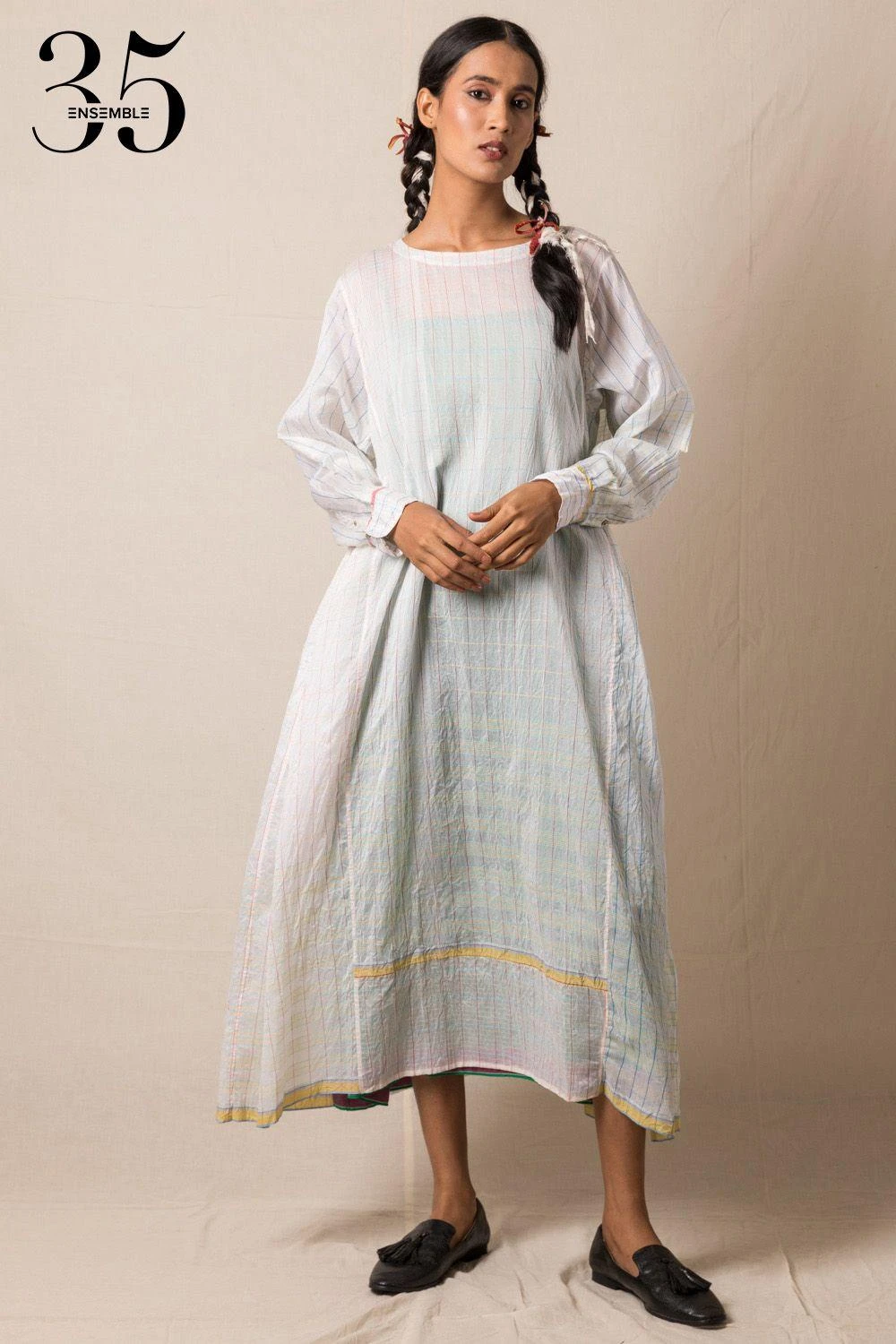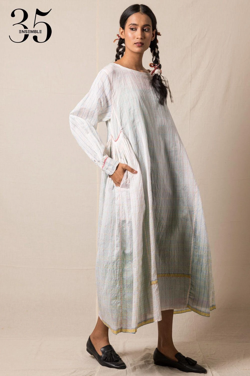 A yearlong celebration of its 35th anniversary telling the story of modern Indian fashion. This white checkered midi dress is made of chanderi with two pockets on the gathered sides. This summer-appropriate piece can be worn for a casual lunch.