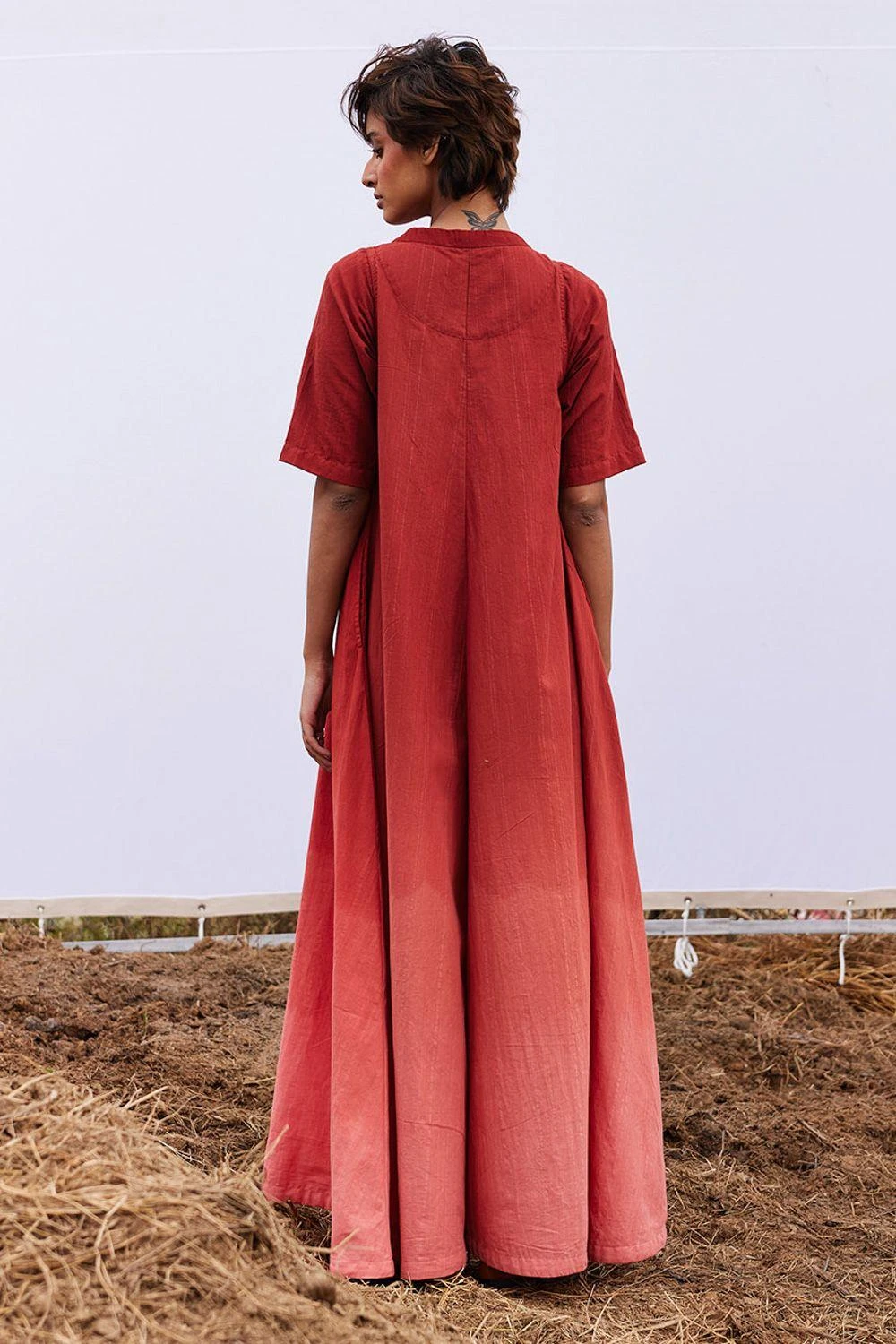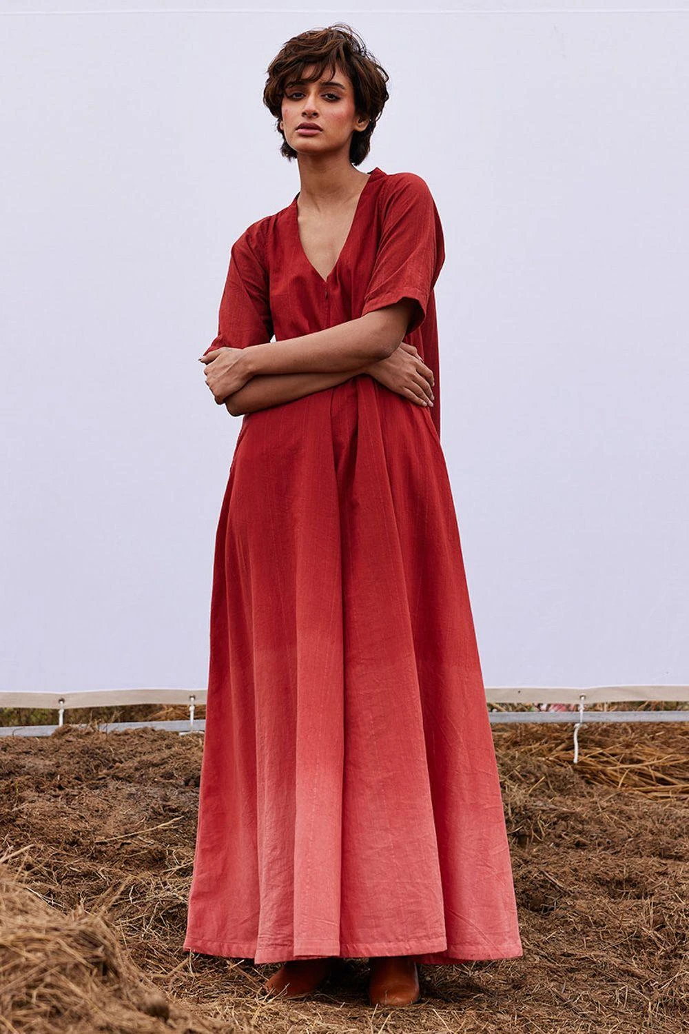 Embrace style in the ombre brick red khadi jumpsuit. With a front zip opening, V-neckline and side seam pockets, it’s chic yet practical.