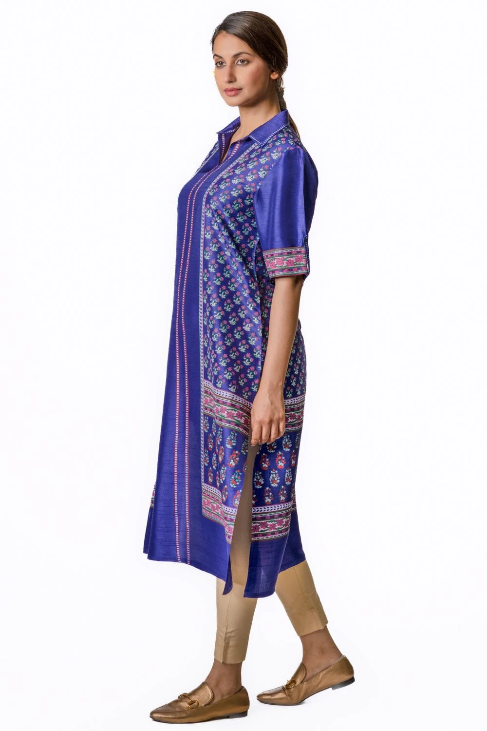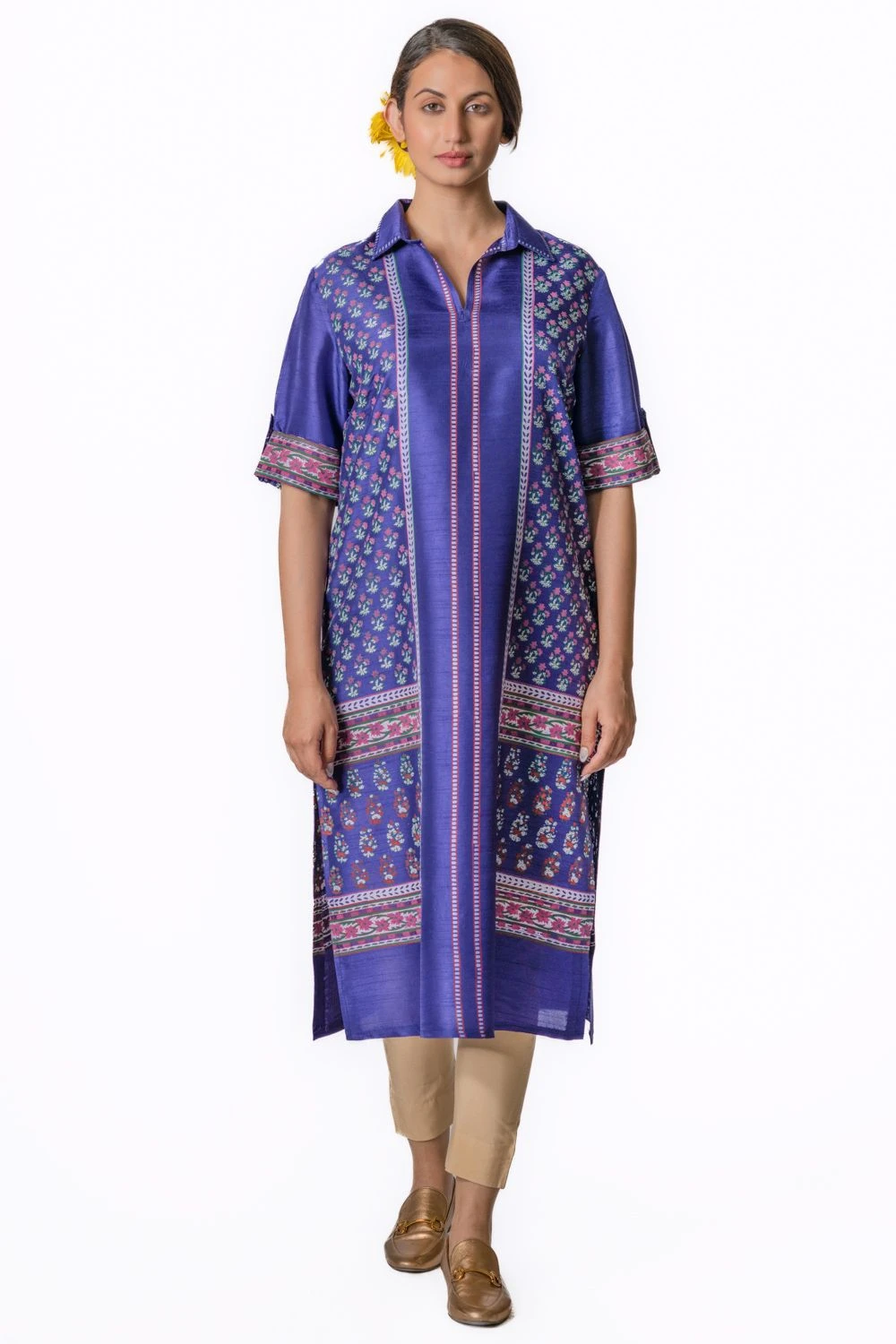 Whether you want to dress it up or down, this purple half-sleeved kurta is a great addition to your wardrobe. It is cut in tussar with spread collar, tab sleeved & floral block printed motifs.