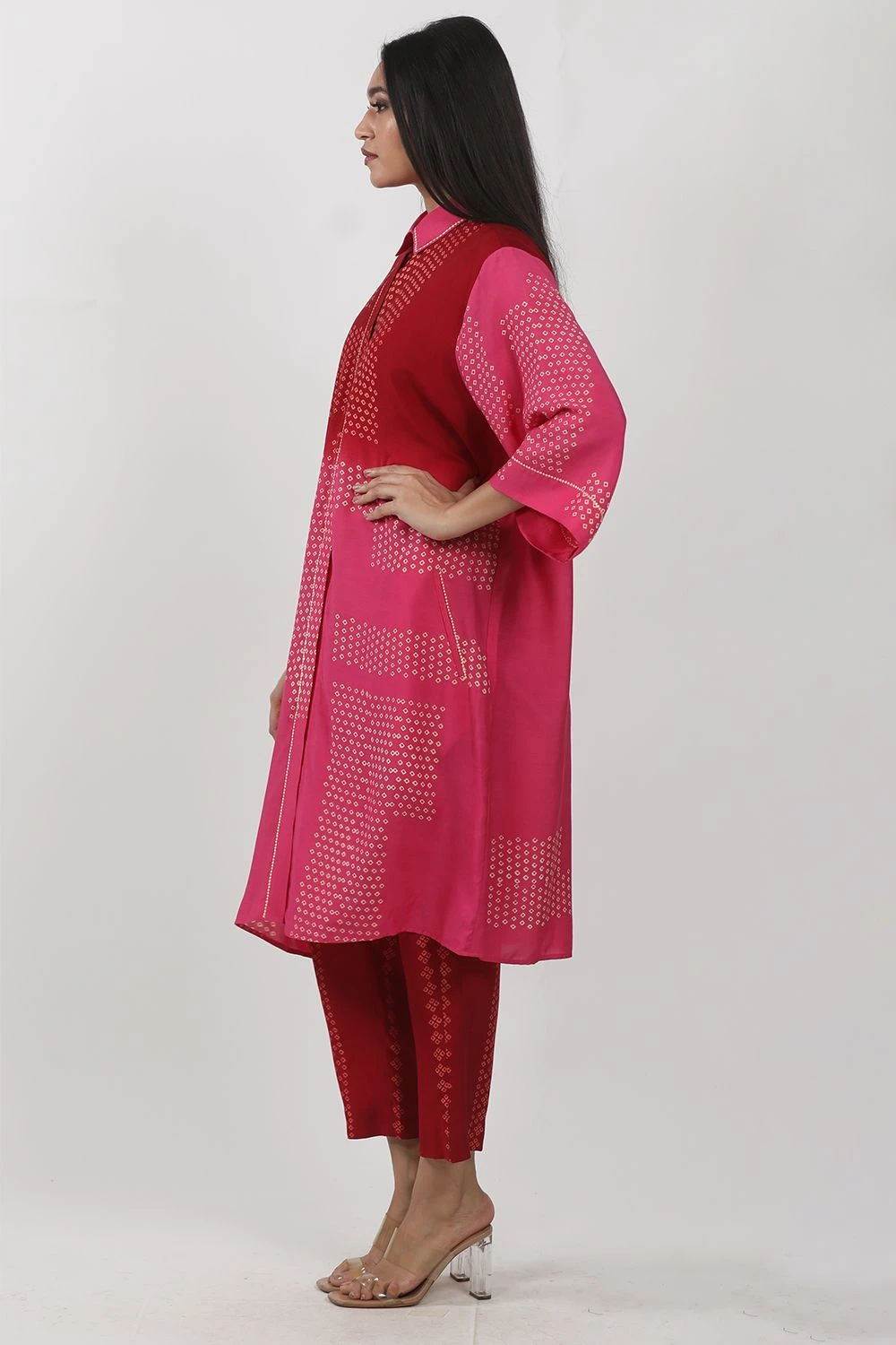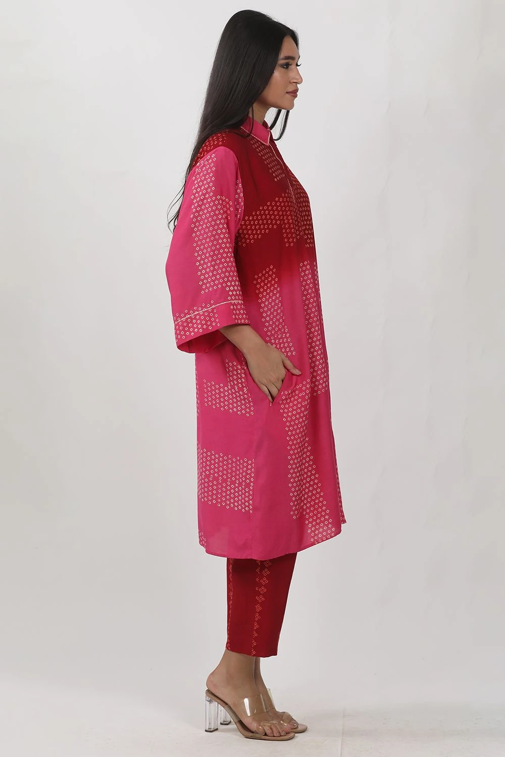 Step into the world of mesmerizing style with this pink tie-dye straight shirt tunic set. Adorned with exquisite embroidery details on the collar, placket, and pockets, it exudes effortless elegance.