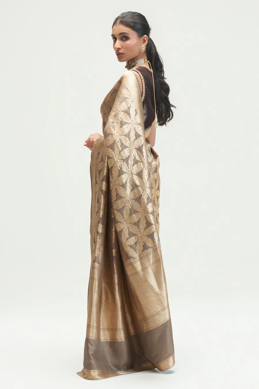 Maximise the life of your wardrobe with this timeless sari. This grey brocade silk sari is a trousseau must-have. It is exuberantly enhanced with intricate zari work and is offset with an equally versatile blouse piece.