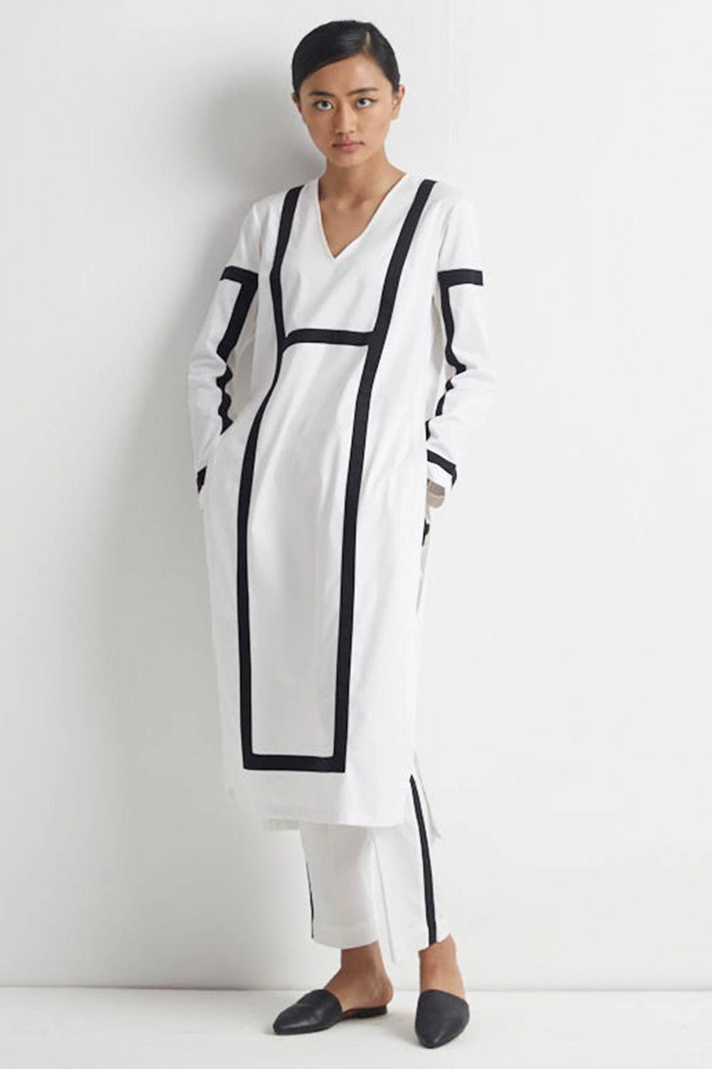 This striking white & black kurta set is cut beautifully. An easy Ensemble favourite for its minimalism factor and versatile use.