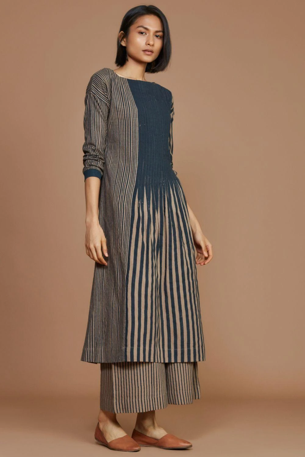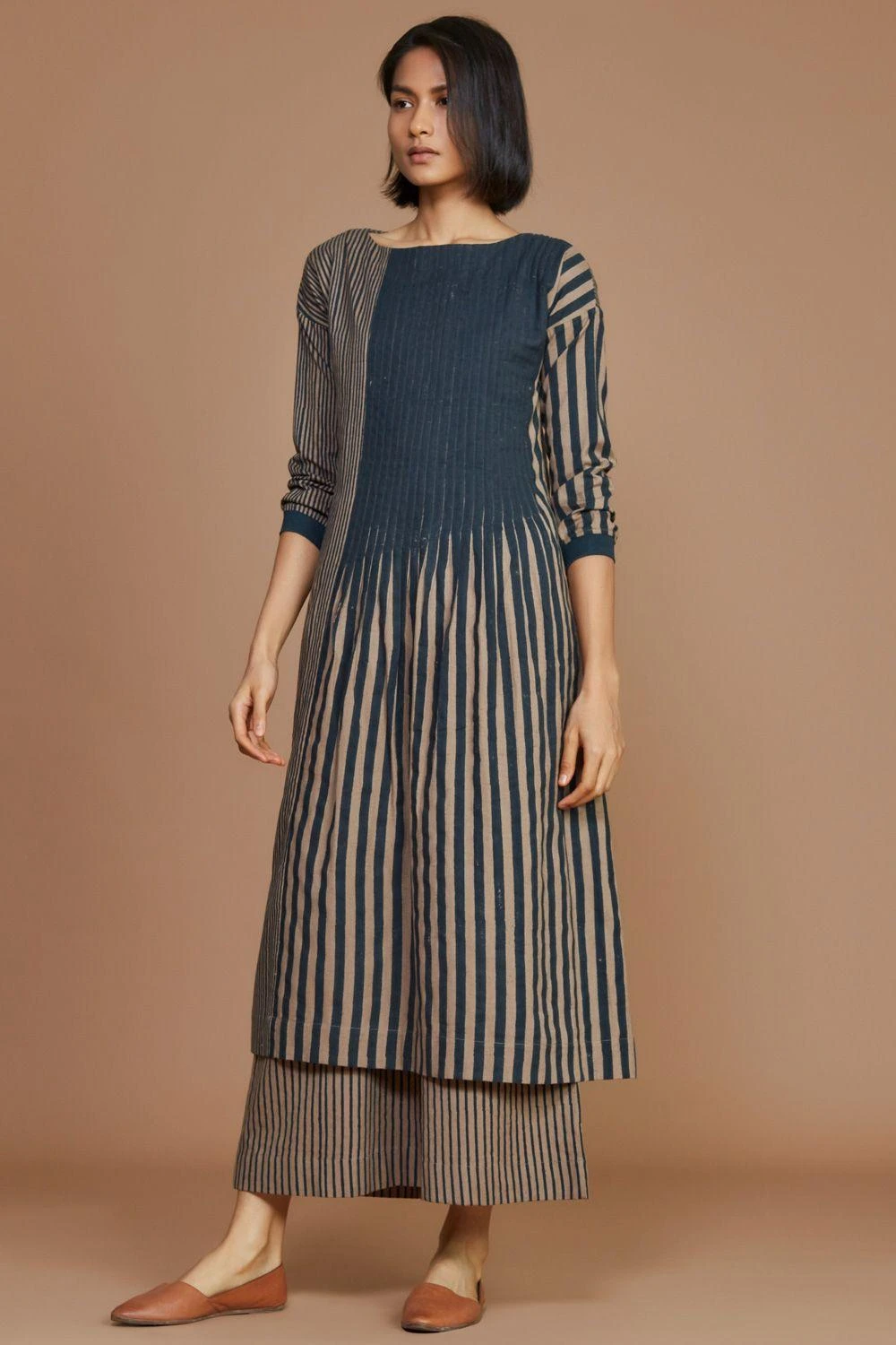 Lounge in or go out, this comfy chic tunic set is a perfect summer staple. It features a colour-blocked tunic in handwoven cotton, paired with matching striped pants. You can add a pair of chic flats for an elevated look.
