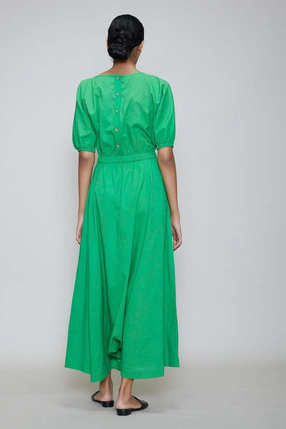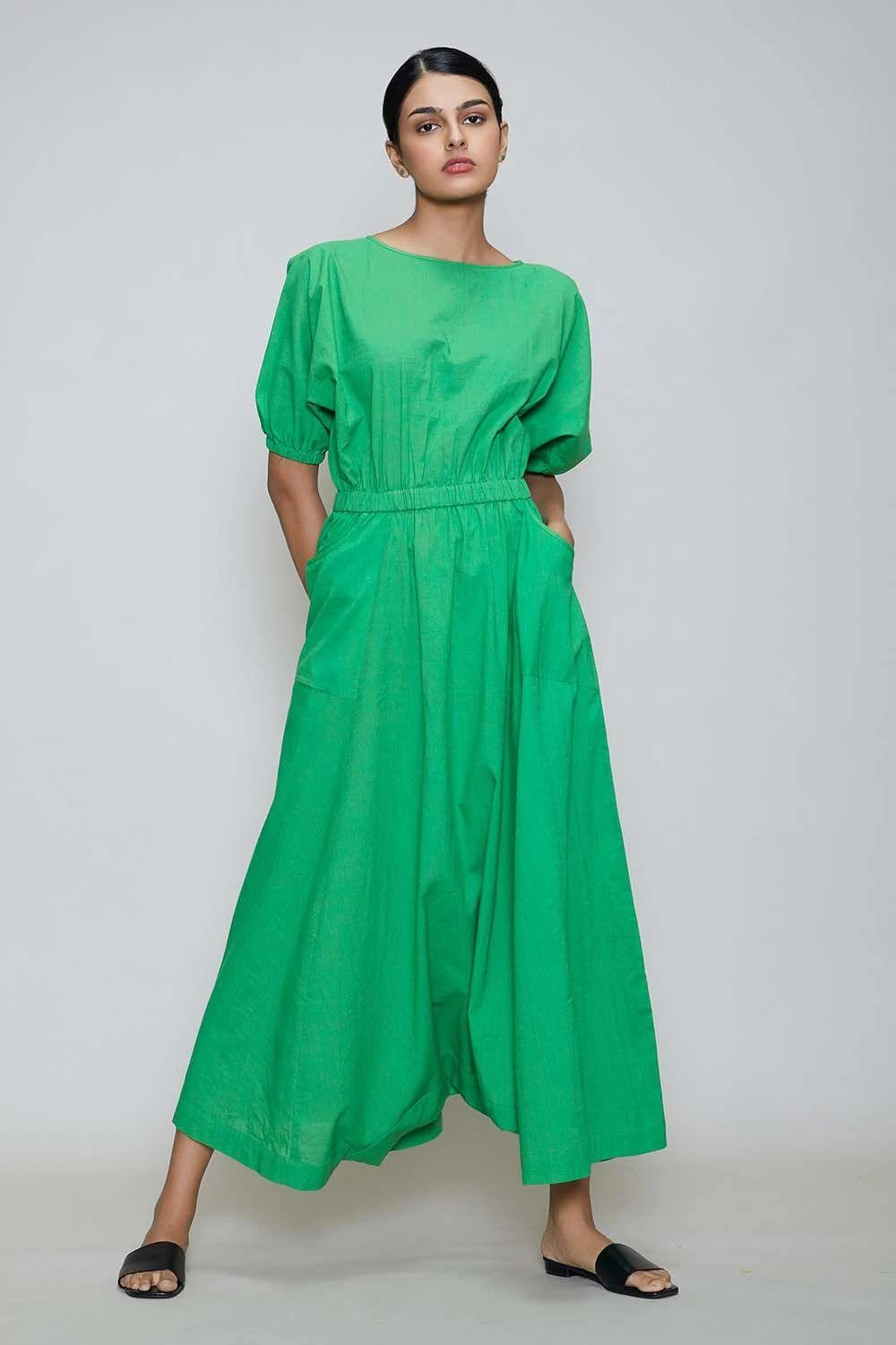 A vibrant, playful & super comfortable jumpsuit made in a refreshing green hue in cotton. It features back button closure with side pockets and a smocking waist. Dress it up or down, that suits your mood, with a few tricks of styling.