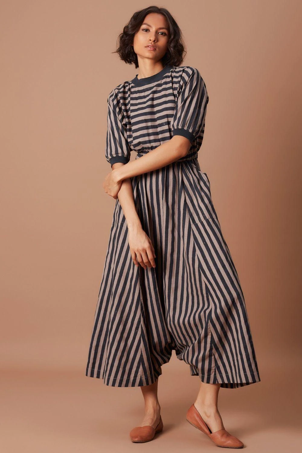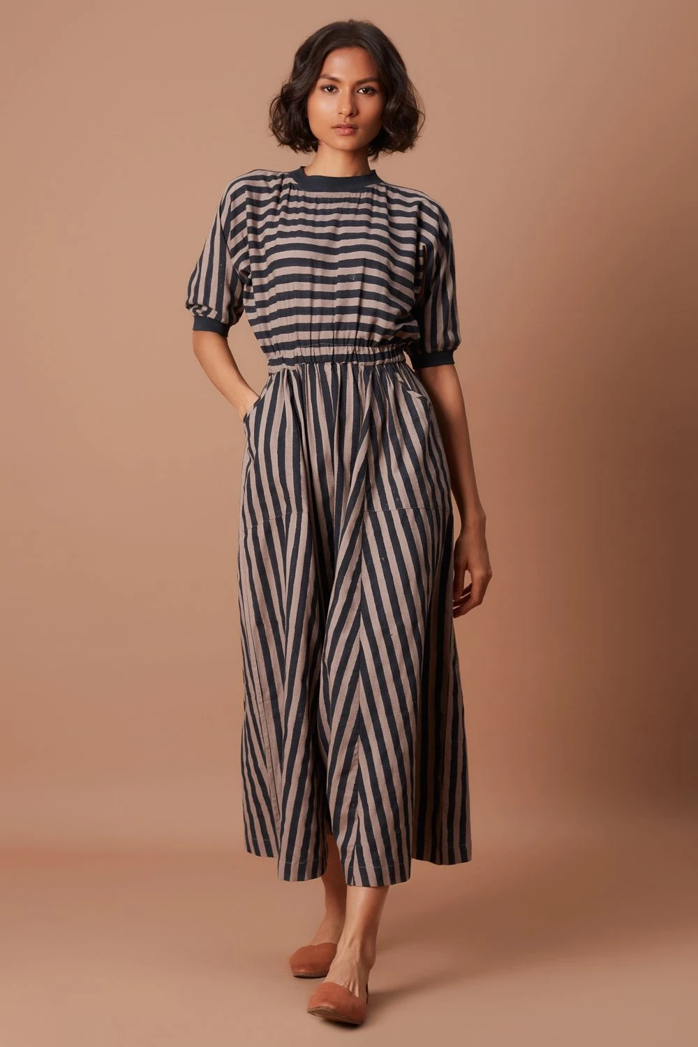 Travel in style & comfort with this grey striped jumpsuit. It is cut in handwoven cotton with a ribbed, neck & sleeve cuff detail. It is cinched at the waist and fastened with back buttons. Style it with a pair of sneakers & you’re good to go.