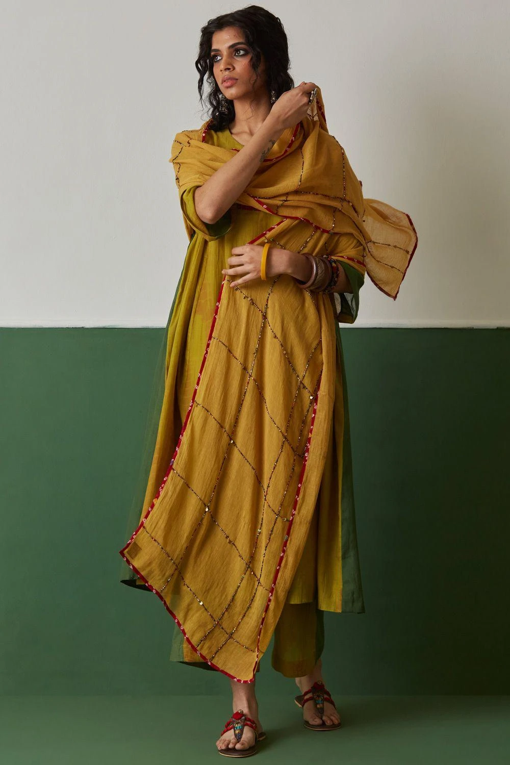 Take your layering game a notch higher with this yellow dupatta. Crafted in cotton, this dupatta features abstract hand embroidered lines all over & a bandhani border. Style it with the yellow hand embroidered kurta from Medha to complete the set.