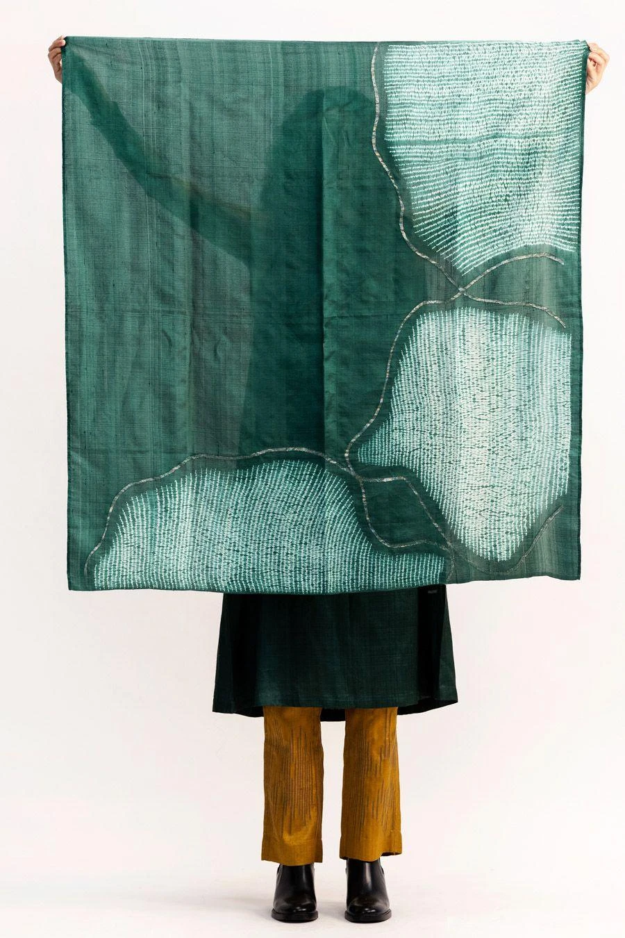 Medium’s new runway collection expands on its work with Jamdani and Bandhani. Crafted in handwoven Bengal silk with jamdani & shibori work, this scarf falls in the realm of luxe minimalism.