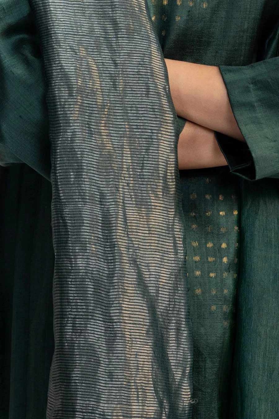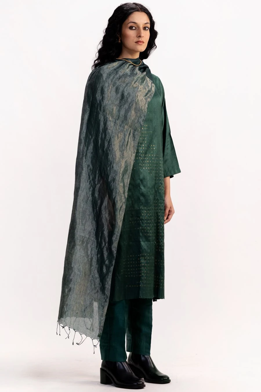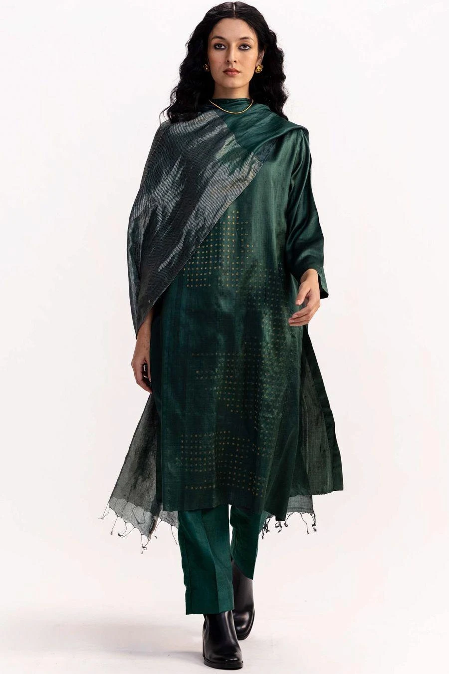 Medium’s new runway collection expands on its work with Jamdani and Bandhani. Crafted in handwoven Bengal silk with jamdani & bandhani work, this handwoven engineered metallic dupatta falls in the realm of luxe minimalism.