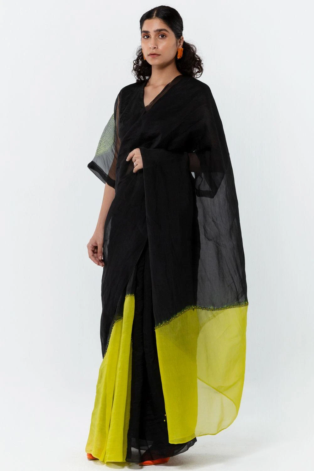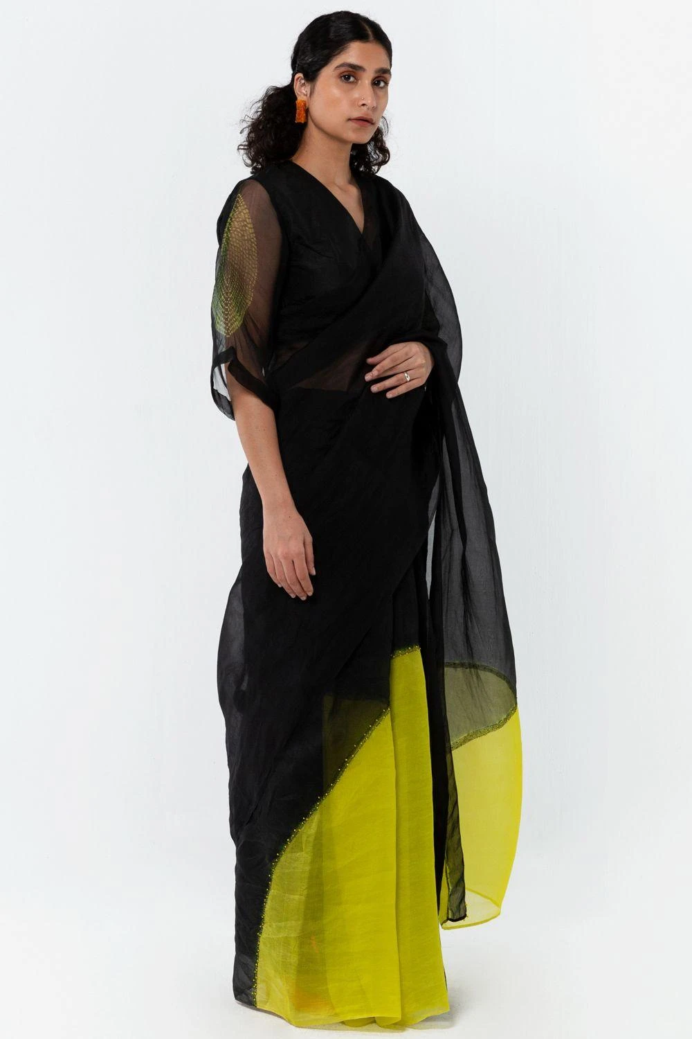 This hand woven organza sari in black is engineered with colour-blocked semi circles hand dyed in lime and detailed with fine kantha embroidery. Complete this elegant look with a solid black blouse.