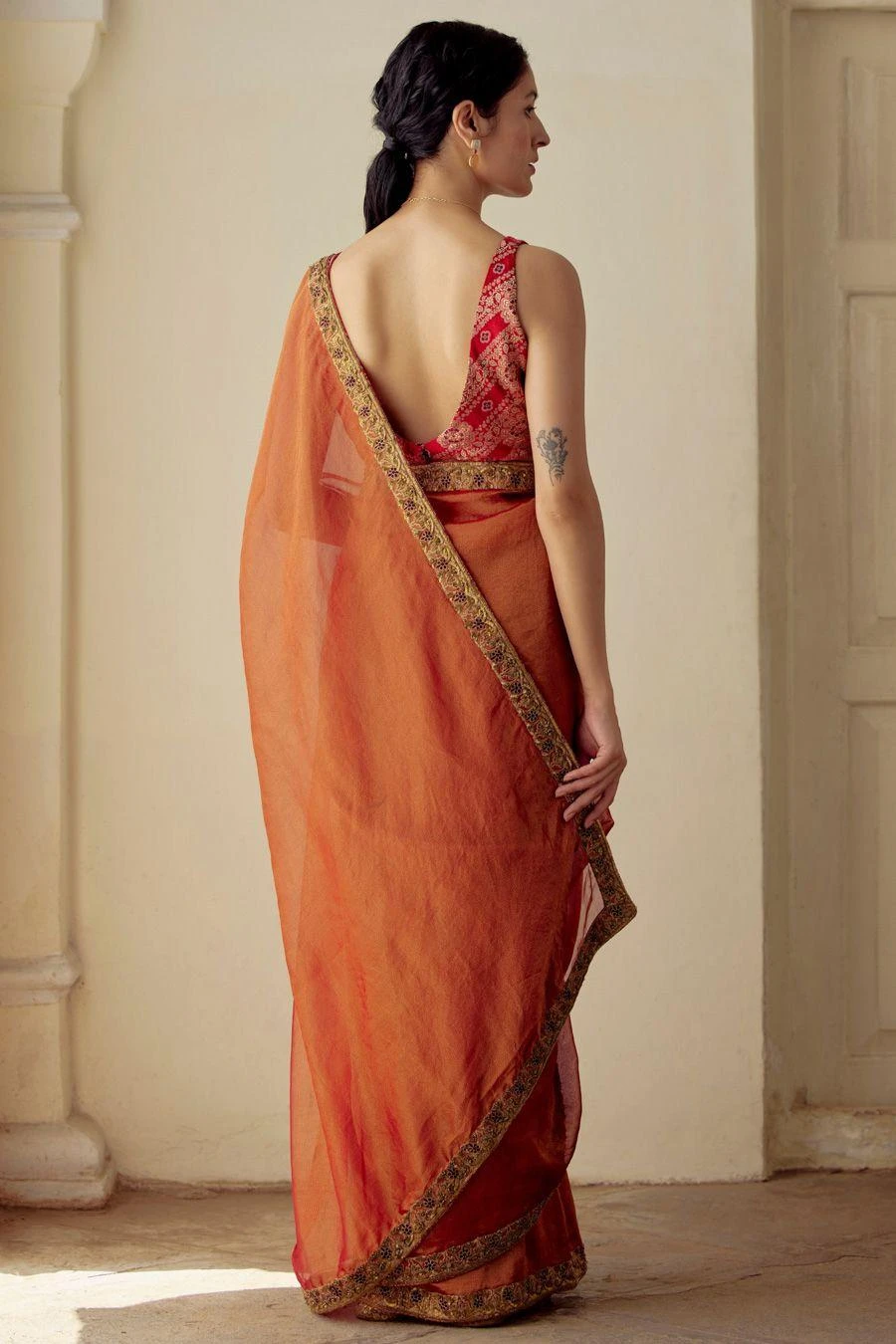This burnt orange sari is a trousseau must-have. This handwoven sari is exuberantly enhanced with intricate embroidery and is offset with an equally versatile blouse piece. Style this set with a pair of jhumkas & a potli to complete the look.
