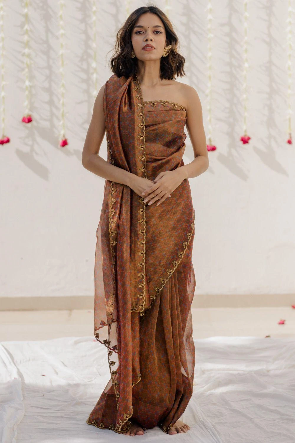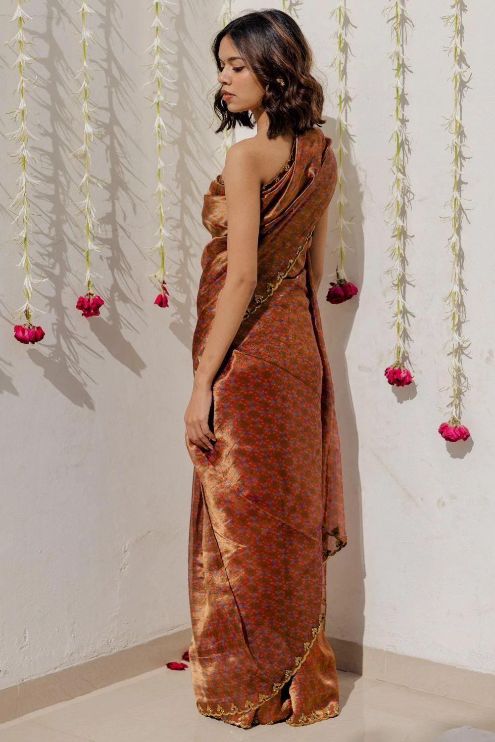 Subtle & elegant, this digitally printed magenta sari is a delight for a minimalistic taste. It is cut in tissue silk and highlighted with an embroidered scalloped border. It comes with an unstitched blouse piece.