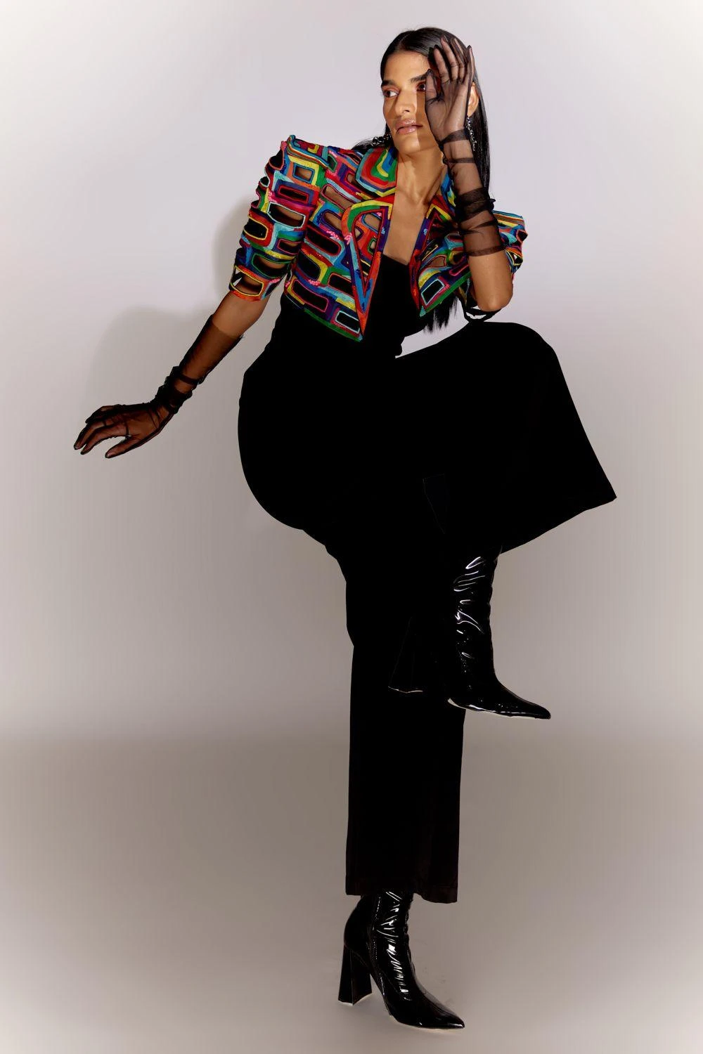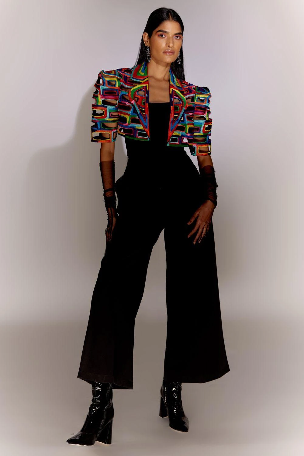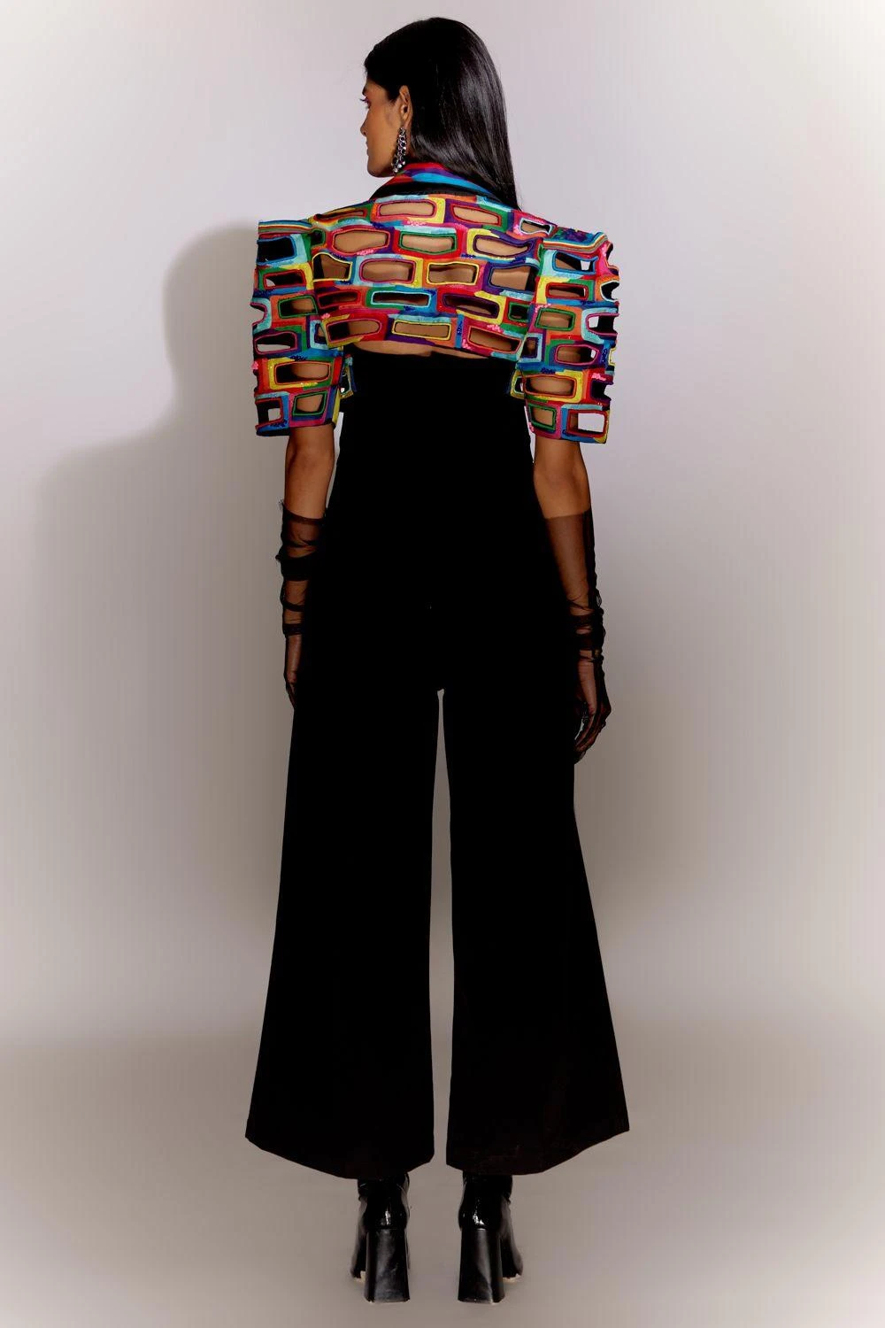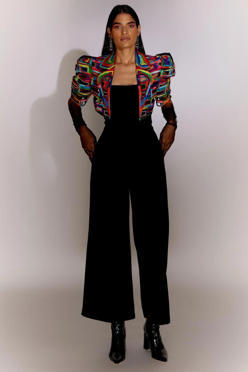 Experience the allure of the Bricks Cutwork Cropped Jacket, adorned with exquisite ria and bead work. This statement piece effortlessly elevates your style. Paired with a sleek black jumpsuit, it creates a chic and sophisticated ensemble.
