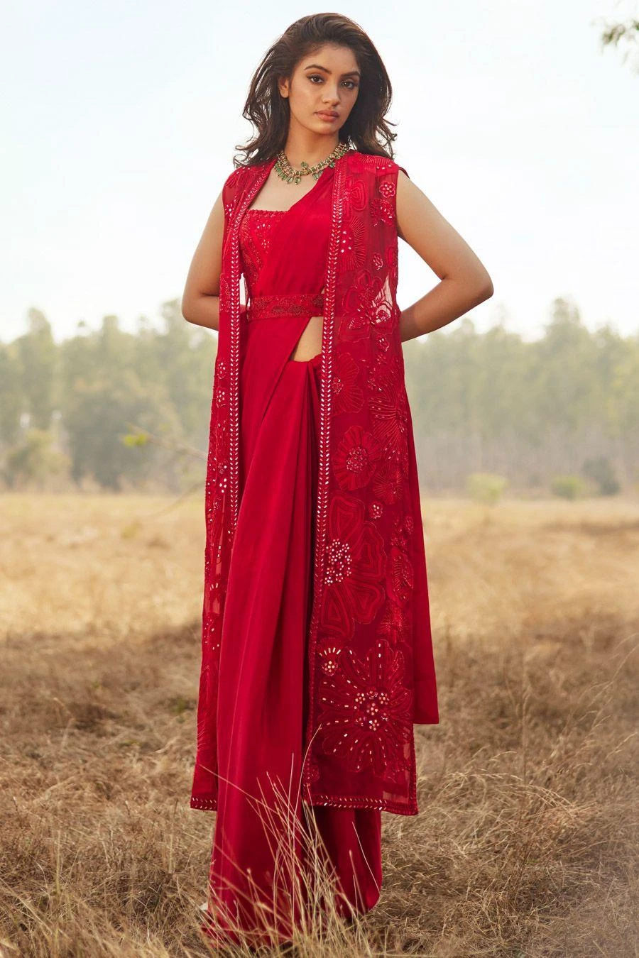 This wedding season, reinvent the classic drape with a concept sari. This red sari is paired with a matching corset and elevated with a floral embroidered cape. The subtle mirror work gives a traditional spin to the modernised silhouette.