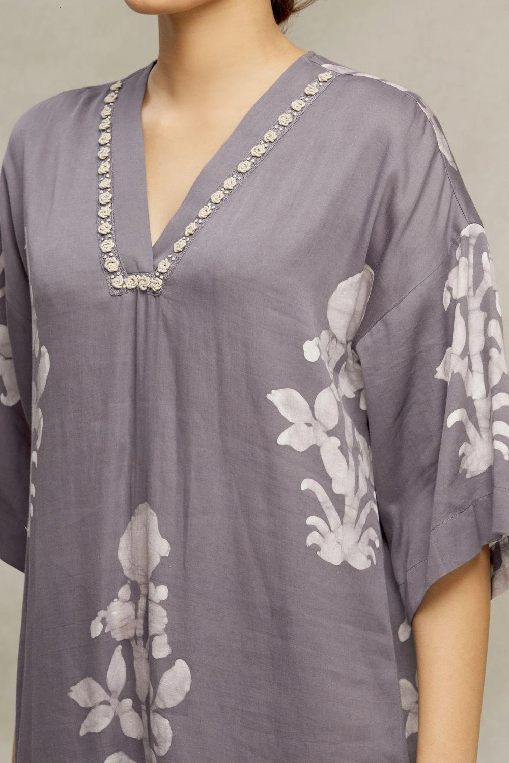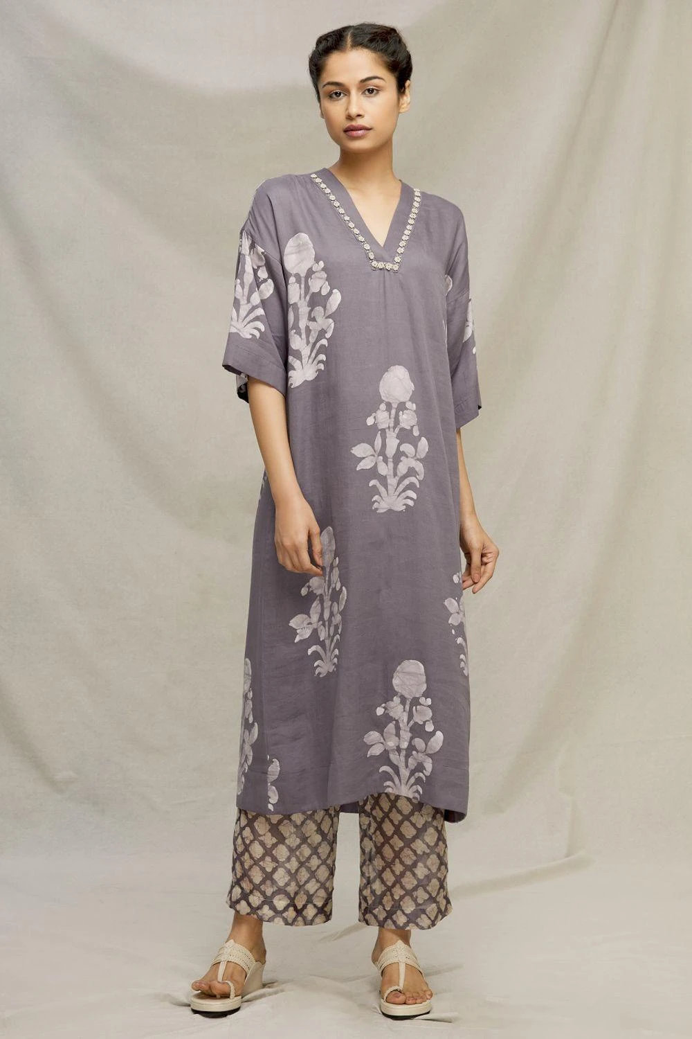 This elegant grey batik printed kurta is set in a cotton satin fabric. The kurta & pant set is highlighted with bullion hand embroidery that makes it perfect for casual daytime activities. Style this set with silver jhumkas to complete the look.