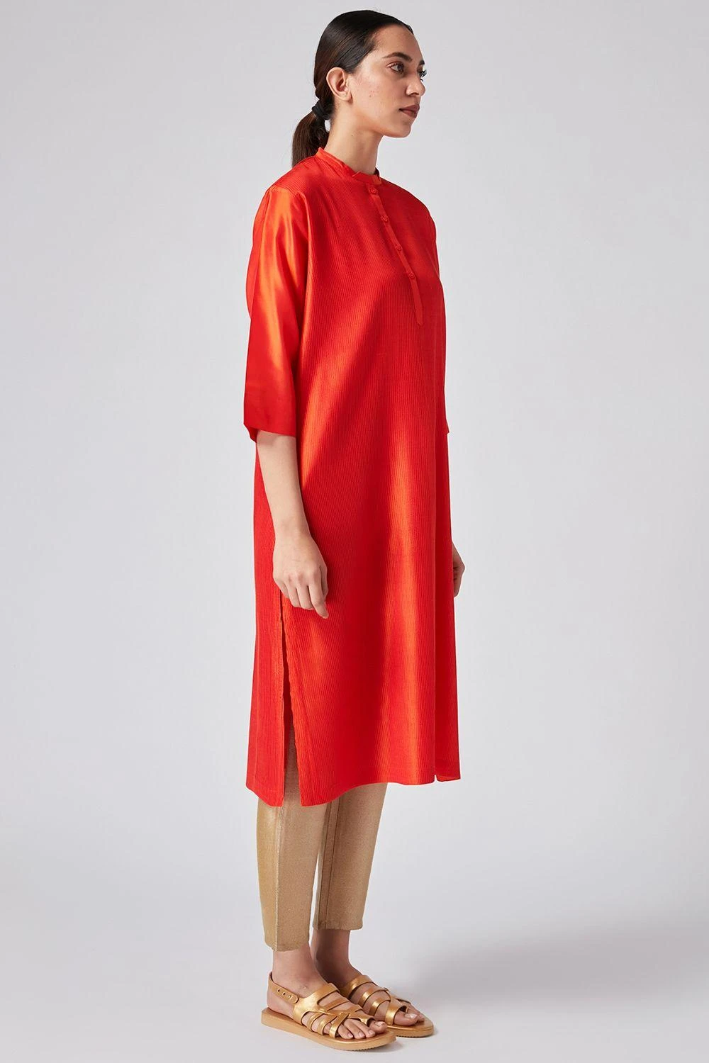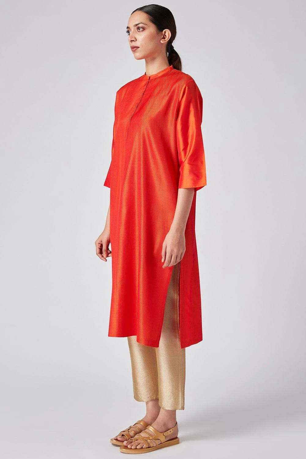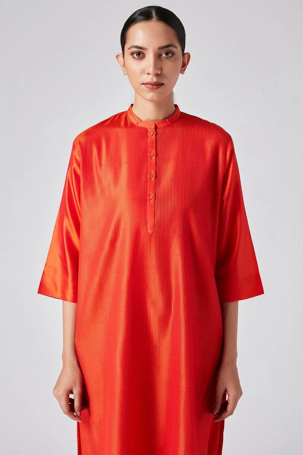 Minimal yet impactful, this orange relaxed fit kurta is set in luxe silk fabric. It features front fine pintucks in tonal thread that uplifts the plain ground. It comes with a pair of churidaar.