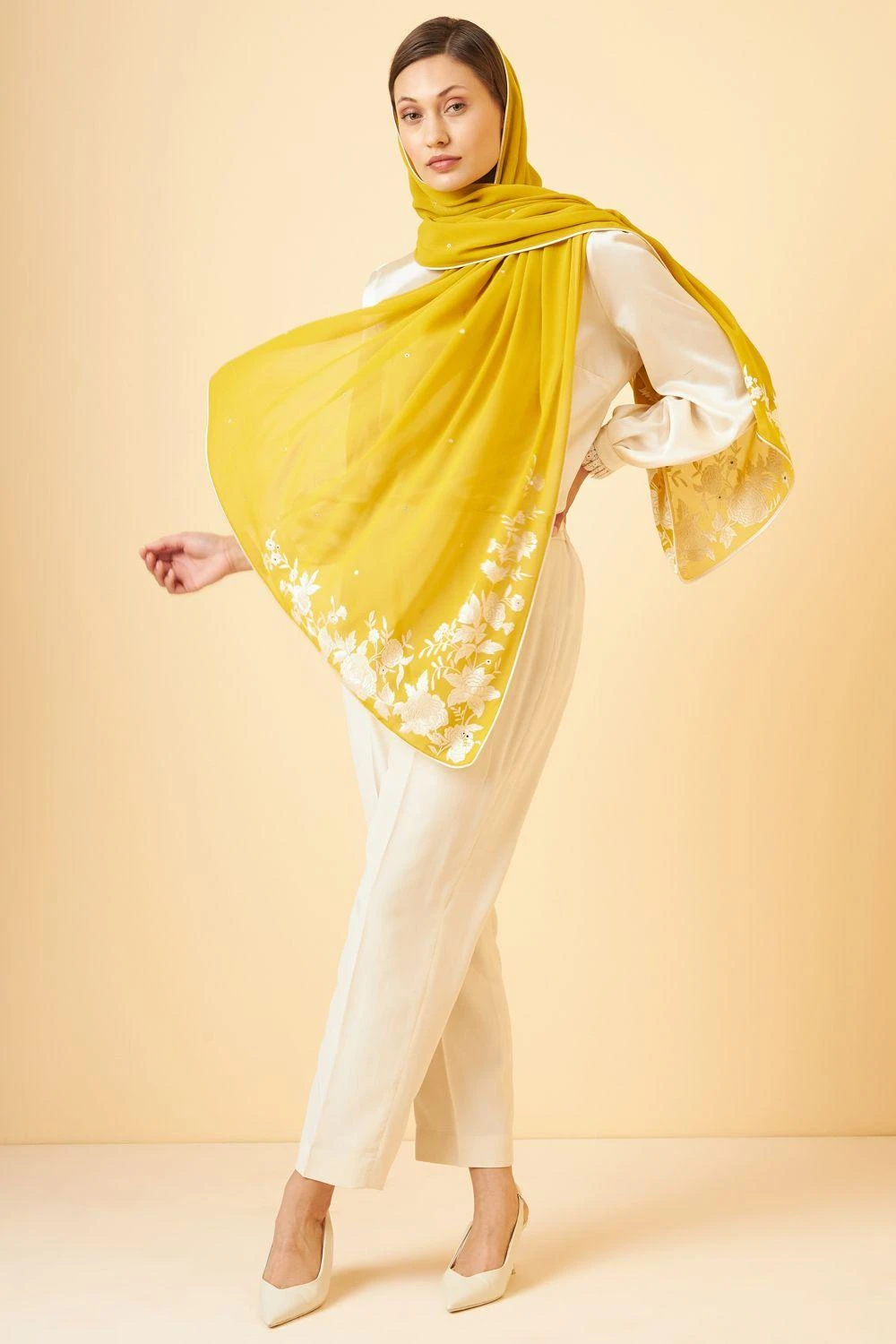 An amalgamation of style & comfort has brought this luxurious gara embroidered stole to life. Crafted in silk georgette, it is hand embroidered in silk threads. Take it out in the evening or wrap around over a day dress for a classic look.