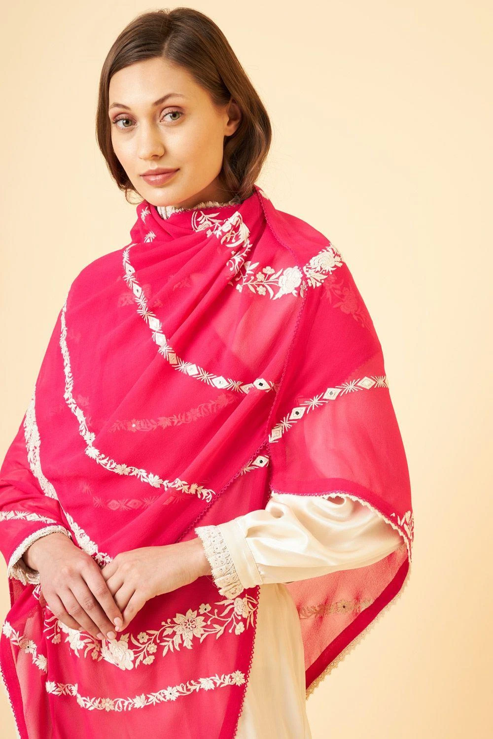 An amalgamation of style & comfort has brought this luxurious gara embroidered stole to life. Crafted in silk georgette, it is hand embroidered in silk threads. Take it out in the evening or wrap around over a day dress for a classic look.
